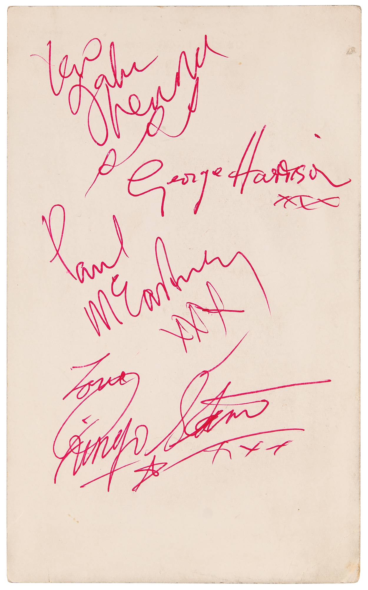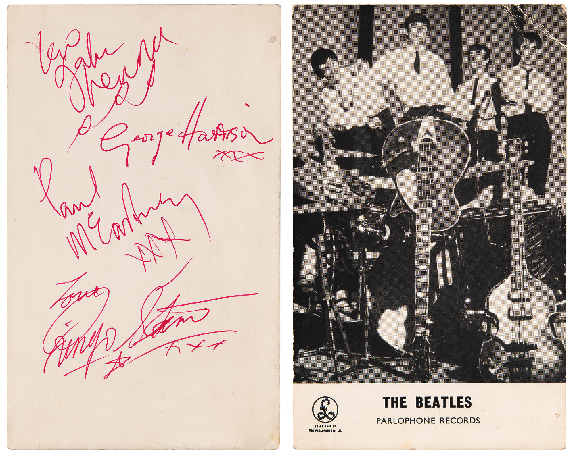 Scarce circa 1963 Parlophone Records promo card of the Beatles posing together behind their instruments, 3.5 x 5.75, signed on the reverse in red ballpoint by John Lennon, Paul McCartney, George Harrison, and Ringo Starr. The consignor notes that the autographs were obtained in the Cheshire area of England in February or March 1963. This image was originally taken by photographer Dezo Hoffman at Abbey Road Studios on September 4, 1962, when the Beatles were recording their first single, 'Love Me Do.’ In fine condition. Accompanied by a certificate of authenticity from Tracks.