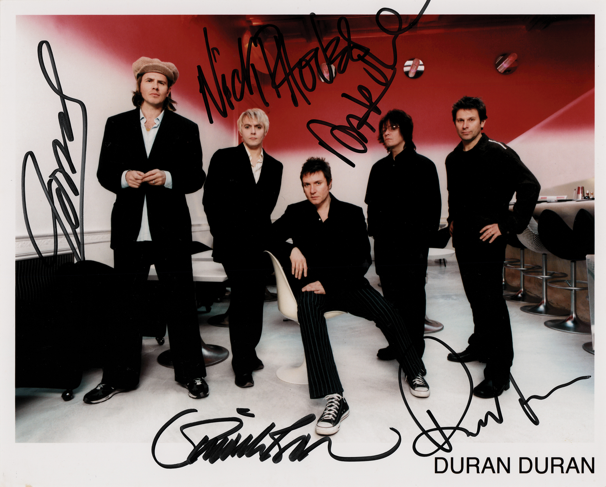 Color satin-finish 10 x 8 publicity photo of Duran Duran wearing black, signed in black felt tip by Simon Le Bon, Nick Rhodes, John Taylor, Andy Taylor, and Roger Taylor. The consignor notes that the autographs date to the 2000s. In fine condition, with scattered small surface creases. Accompanied by a certificate of authenticity from Tracks.