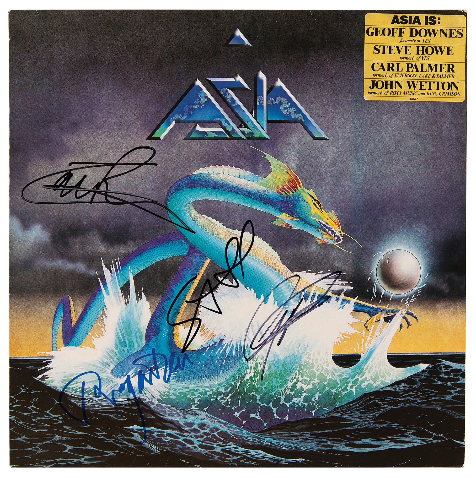 Self-titled debut album from Asia, signed on the front cover in black felt tip by Geoff Downes, Steve Howe, and Carl Palmer, and in blue felt tip by cover artist Roger Dean. In fine condition. The record is included.