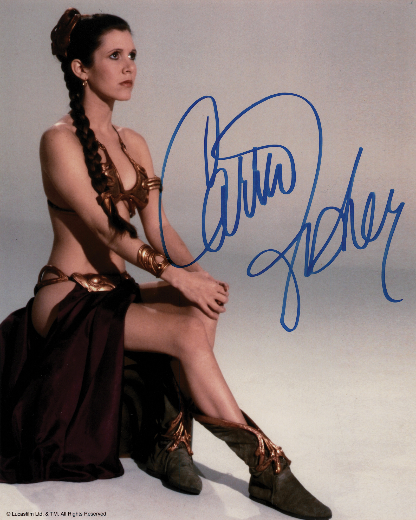 Color satin-finish 8 x 10 photo of Carrie Fisher in her iconic 'Slave Leia' costume from the 1983 Star Wars film Return of the Jedi, signed prominently in blue felt tip. In fine condition.