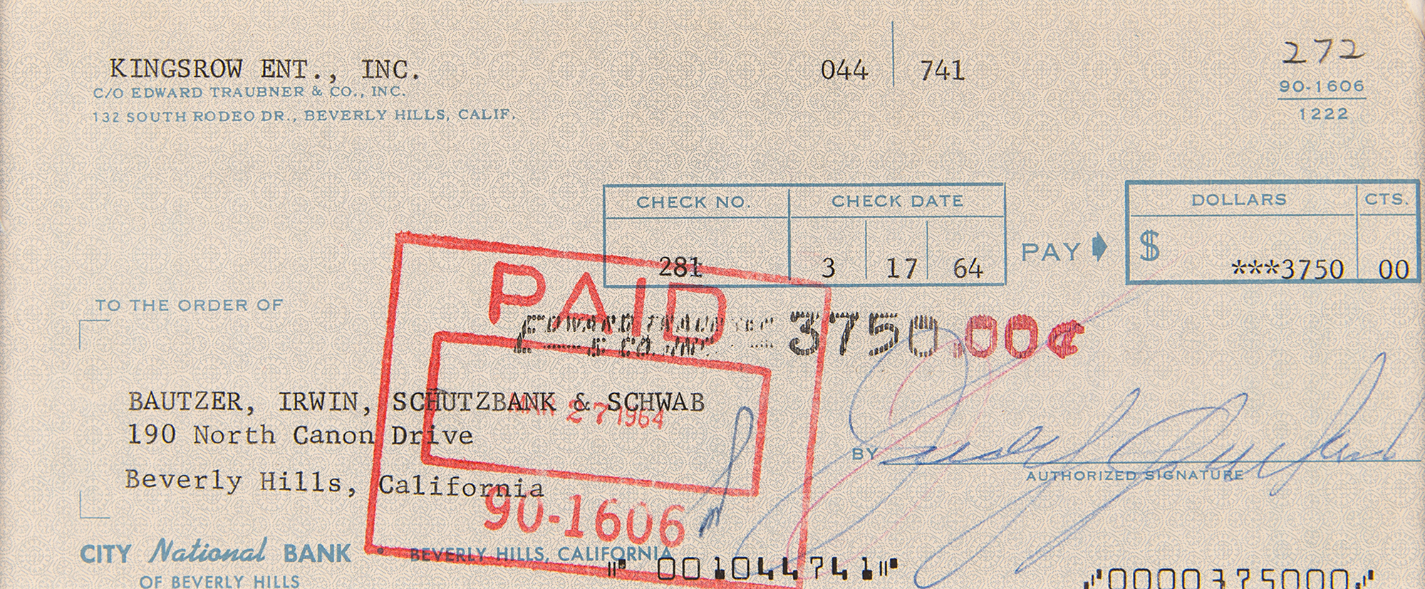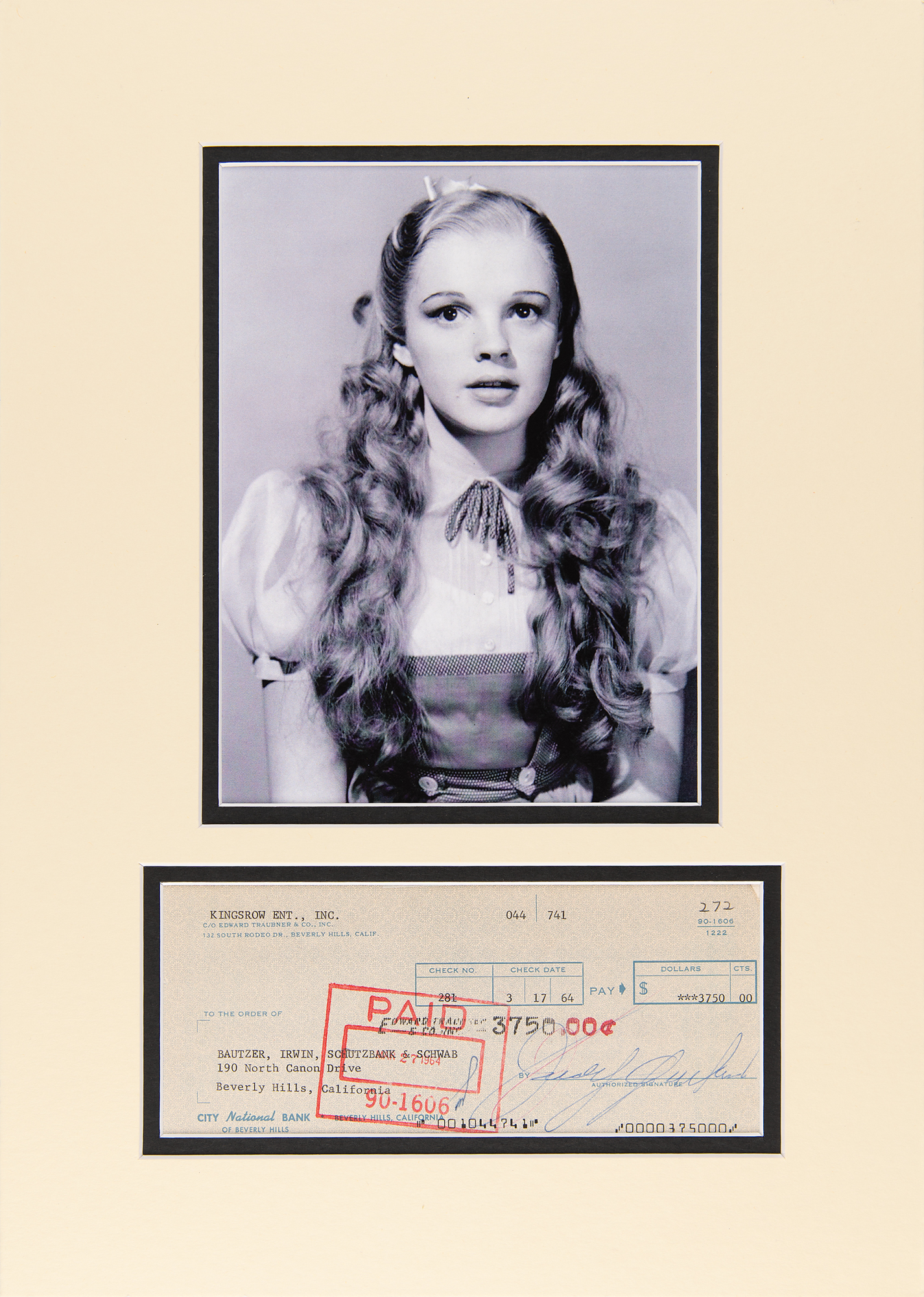 Kingsrow Ent., Inc. business check, 7.25 x 3, filled out in type and signed by Judy Garland, payable to Bautzer, Irwin, Schutzbank & Schwab for $3750, March 17, 1964. Double-matted with a photo of the actress to an overall size of 11.25 x 15.75. In fine condition.
