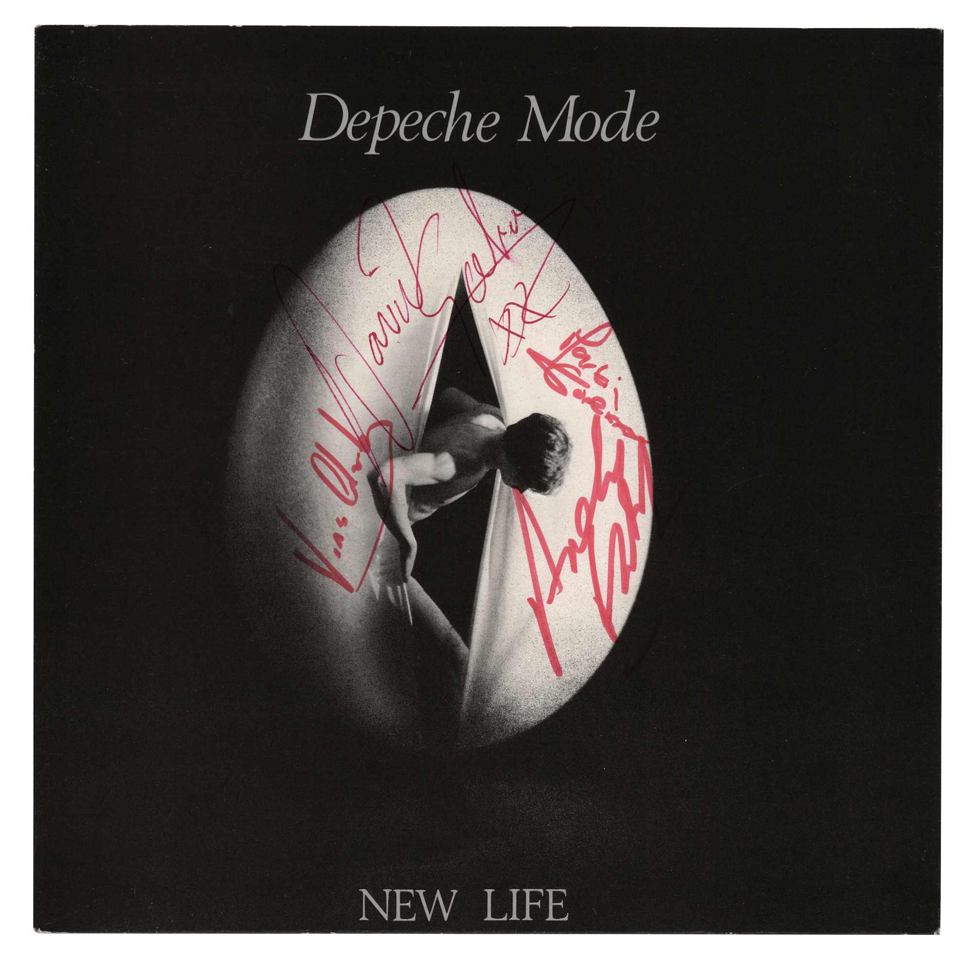 Mute Records 45 RPM single record for ‘New Life / Shot!’ by Depeche Mode, signed on the front cover in red felt tip and ballpoint by Vince Clarke, Andy Fletcher, Dave Gahan, and Martin Gore. In fine condition. The record is not included.