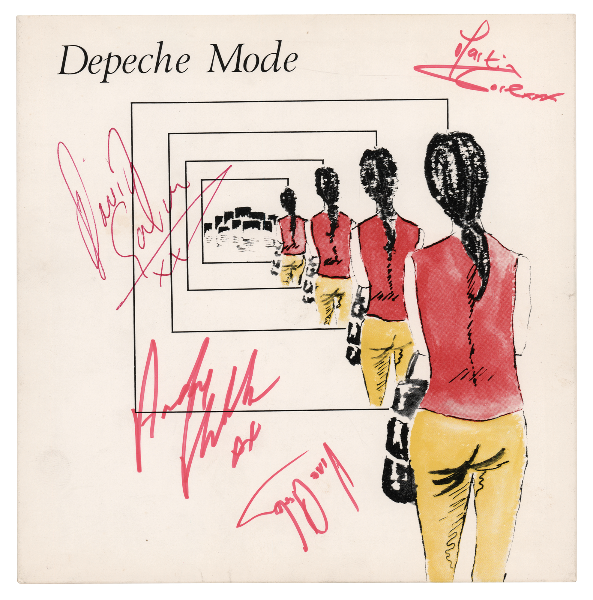 Mute Records 45 RPM single record for ‘Dreaming of Me / Ice Machine’ by Depeche Mode, signed on the front cover in red felt tip and ballpoint by Vince Clarke, Andy Fletcher, Dave Gahan, and Martin Gore. In fine condition. The record is not included.