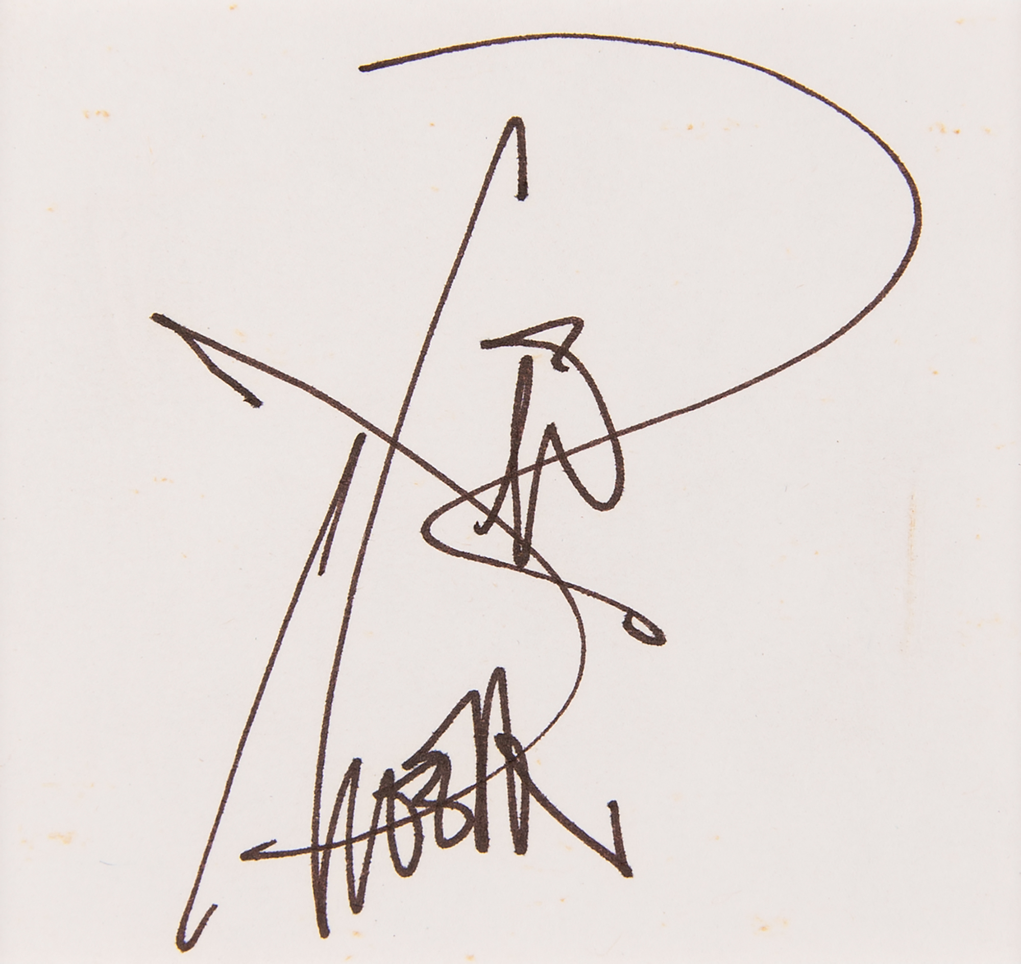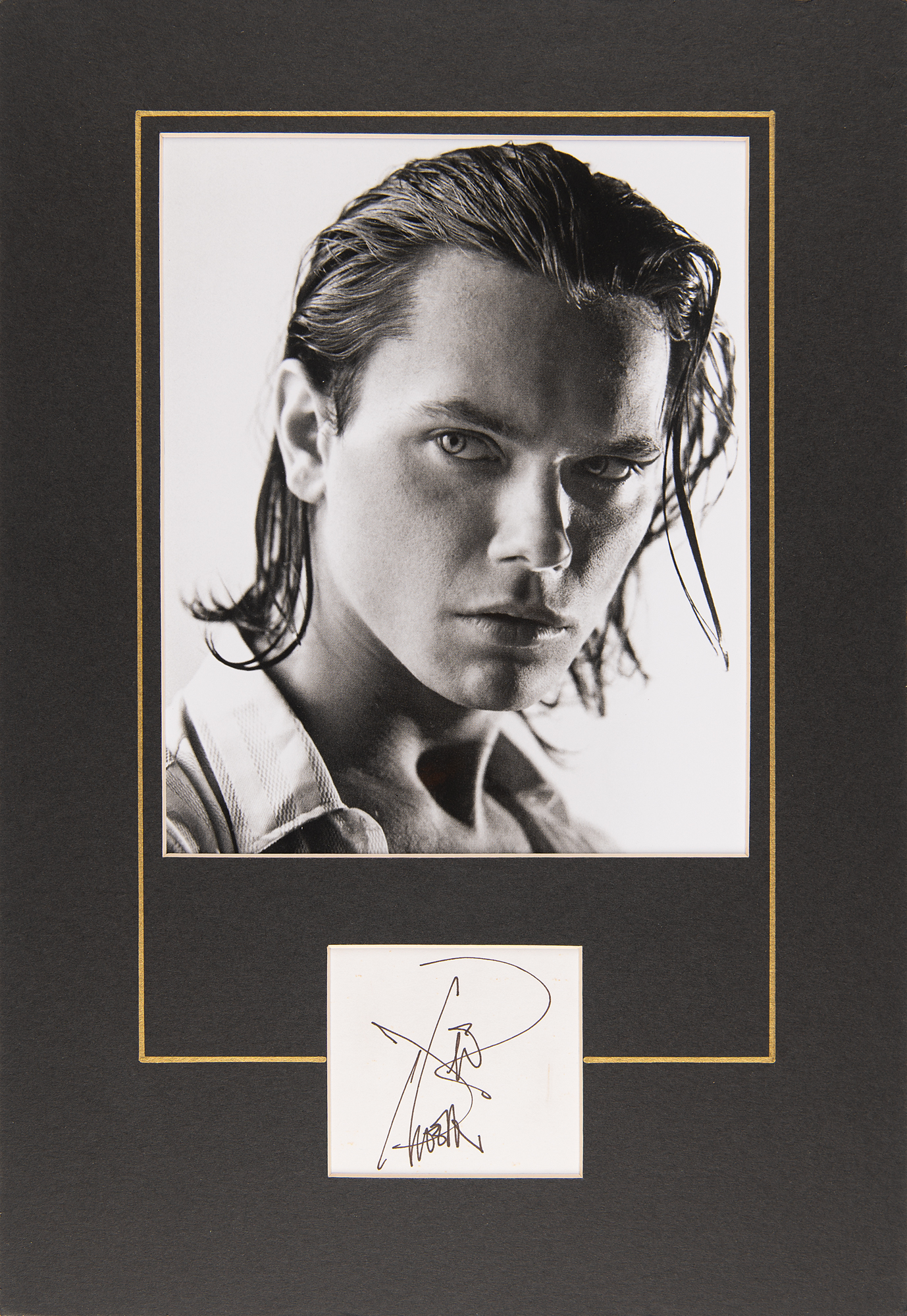 Sought-after ink signature, "River Phoenix,” on an off-white 3 x 2.75 sheet, which is matted with a photo of the actor to an overall size of 11 x 16. In fine condition. Originally obtained in person by noted collector Jan Schray.