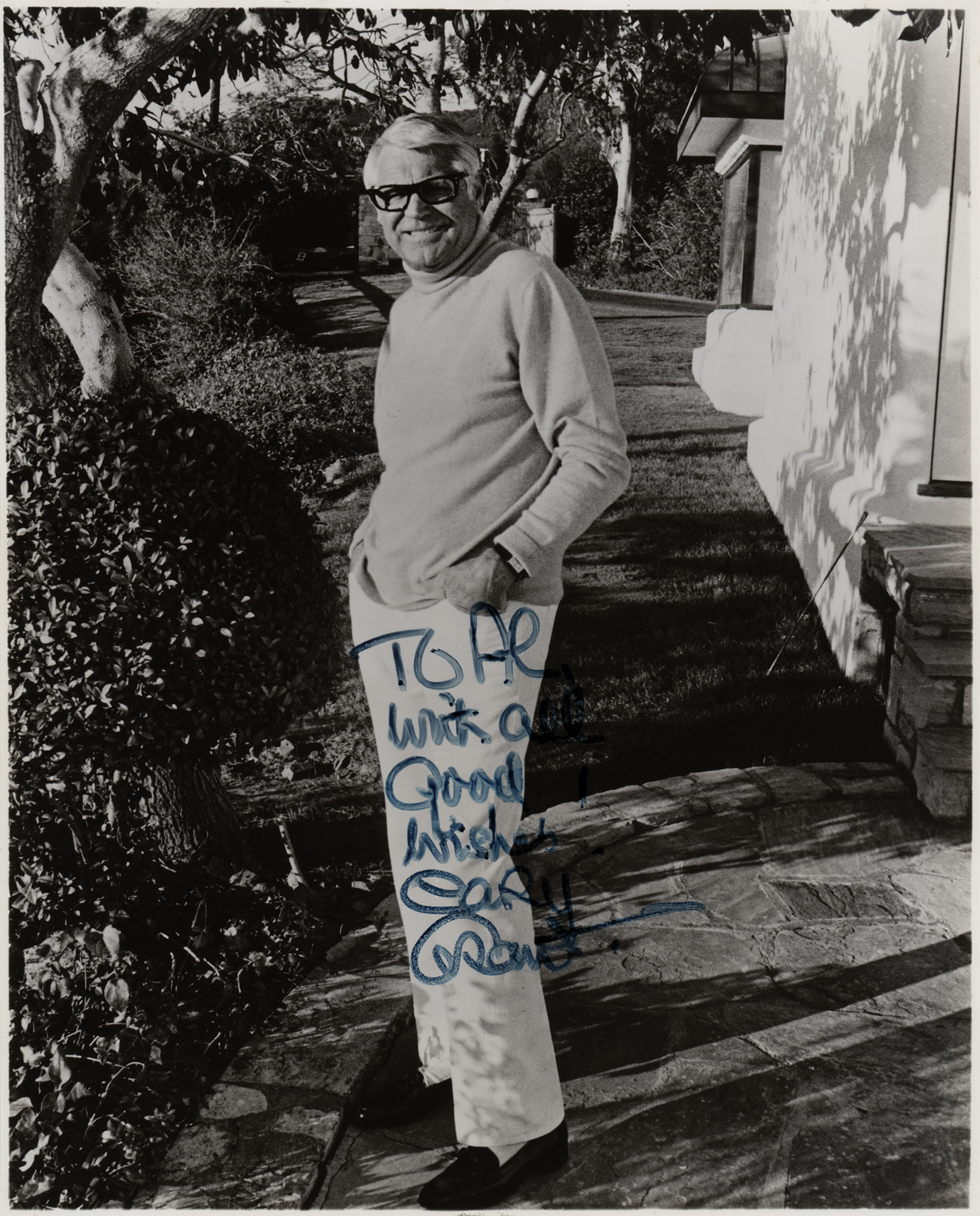 Glossy 7.75 x 9.5 photo of Cary Grant in later age posing outdoors with his hands in his pockets, signed and inscribed in felt tip, "To Al, with all good wishes, Cary Grant.” In fine condition, with trimmed borders.