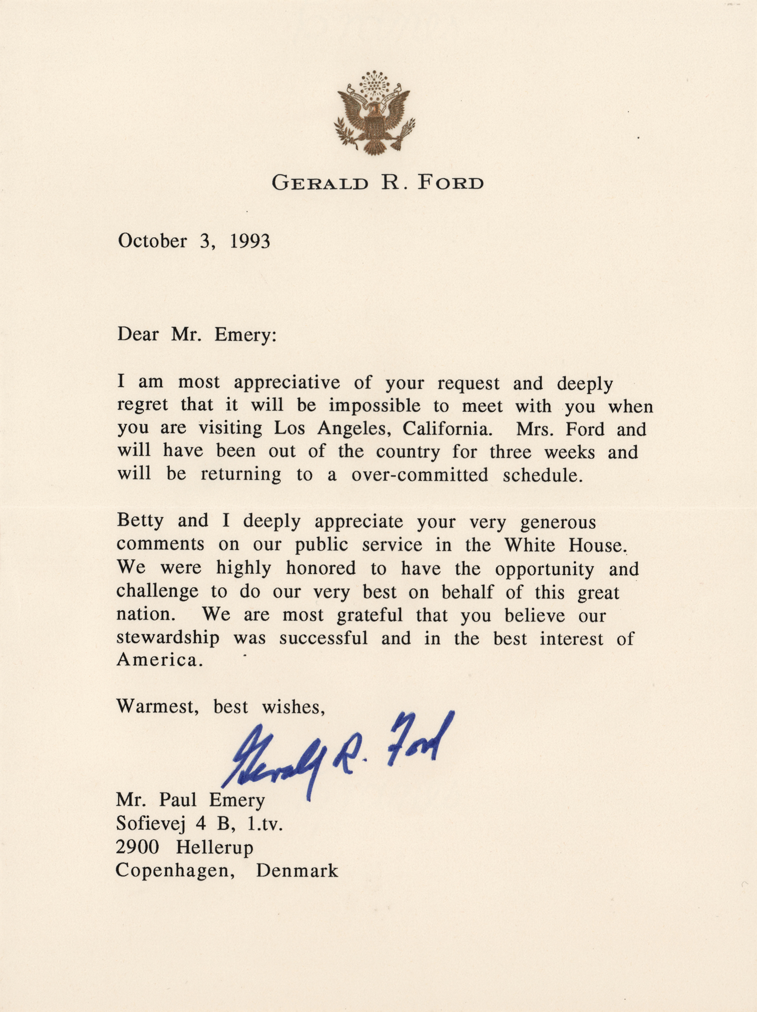TLS signed “Gerald R. Ford,” one page, 6.5 x 8.5, personal letterhead, October 3, 1993. Letter to Paul Emery, in full: “I am most appreciative of your request and deeply regret that it will be impossible to meet with you when you are visiting Los Angeles, California. Mrs. Ford and [I] will have been out of the country for three weeks and will be returning to [an] over-committed schedule. Betty and I deeply appreciate your very generous comments on our public service in the White House. We were highly honored to have the opportunity and challenge to do our very best on behalf of this great nation. We are most grateful that you believe our stewardship was successful and in the best interest of America.” In very fine condition. Accompanied by the original mailing envelope bearing his facsimile signature.