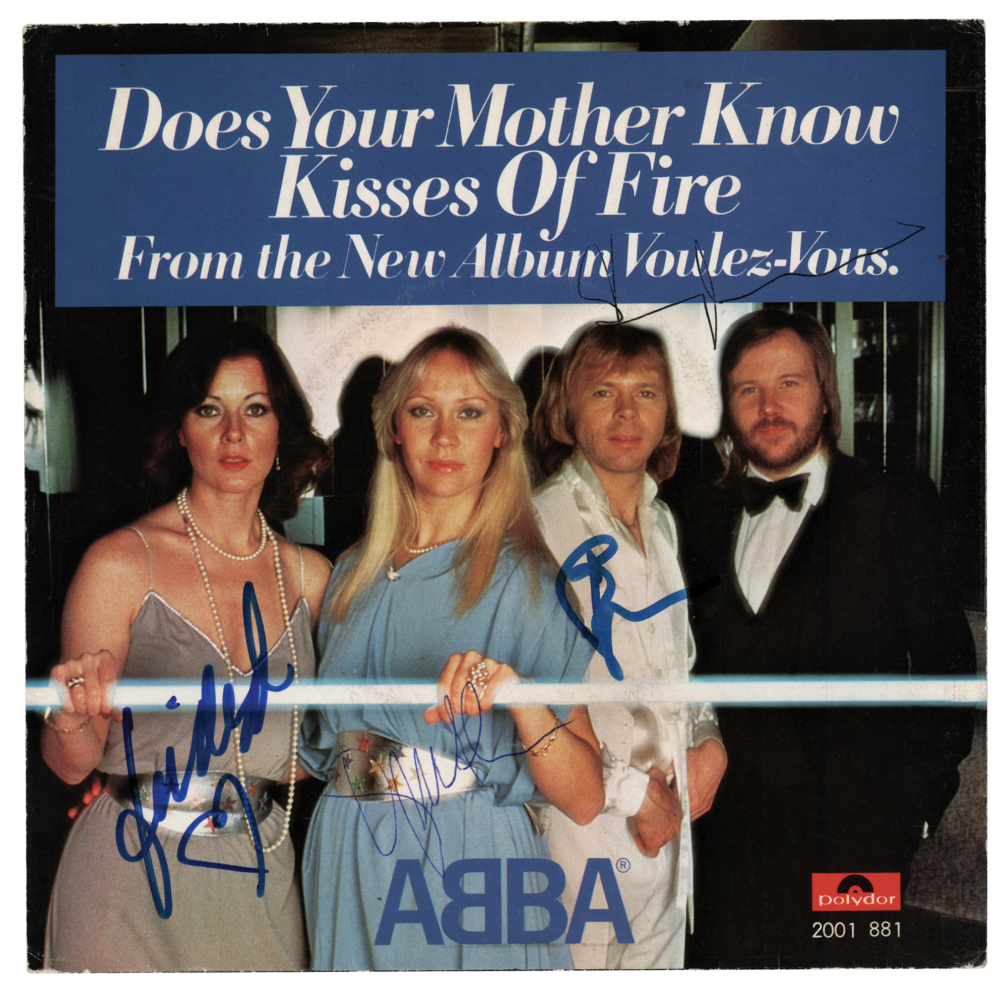 Polydor Records 45 RPM single record for ‘Does Your Mother Know / Kisses of Fire’ by ABBA, signed on the front cover in blue ballpoint and felt tip by Agnetha Fältskog, Björn Ulvaeus, Benny Andersson, and Anni-Frid Lyngstad. In fine condition. The record is not included.