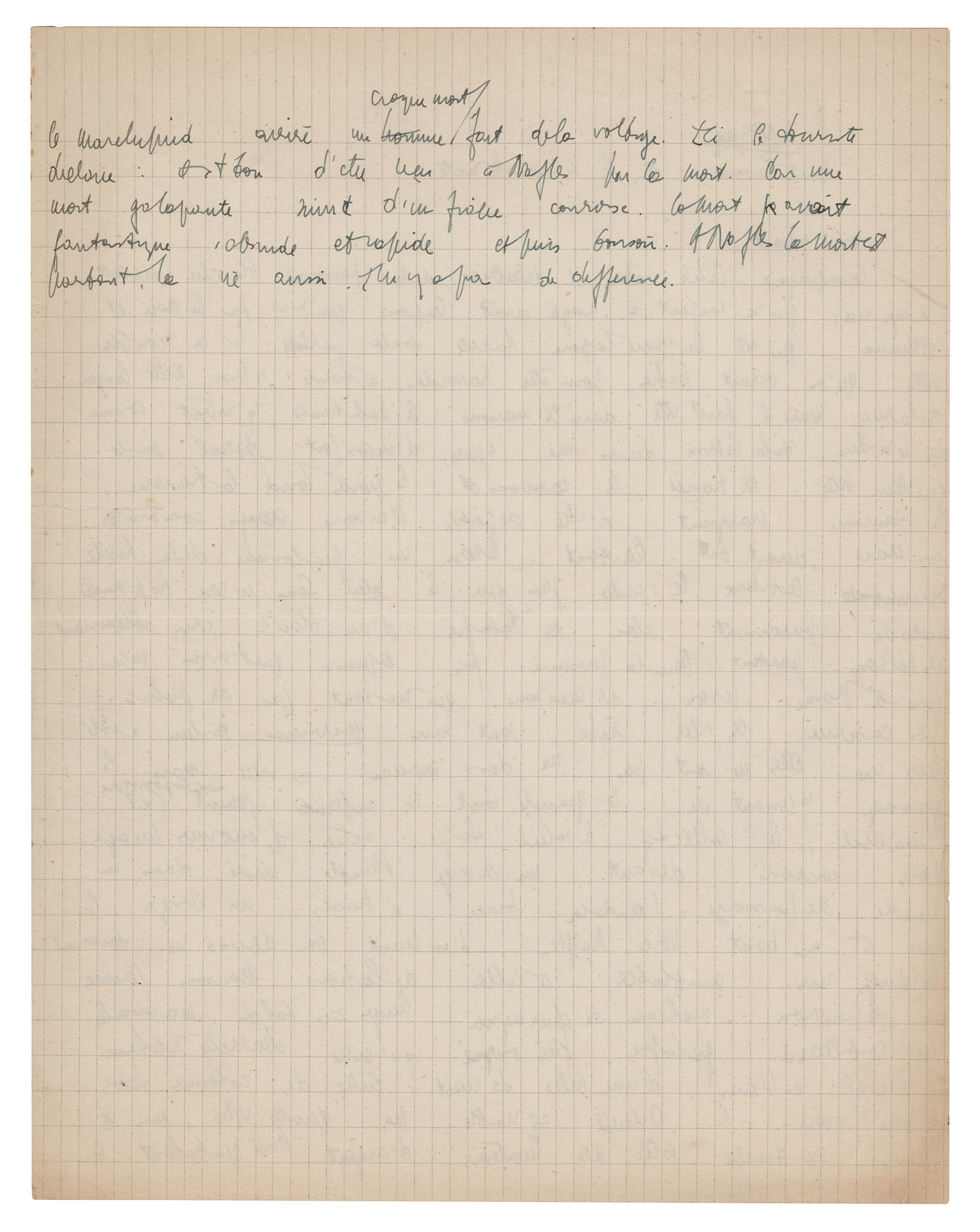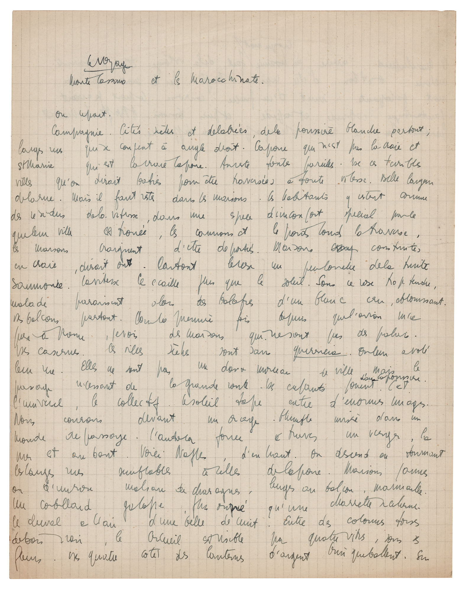 Superb autograph manuscript by Jean-Paul Sartre, unsigned, in French, penned in black ink on both sides of an 8.25 x 10.5 sheet of graphing paper, no date. Entitled “The journey, Monte Cassino and the Marocchinate, Departure,” the manuscript contains Sartre's reflection on Monte Cassino, an Italian battleground during World War II and the site of Marocchinate, a term applied to the mass rape and killings after the Battle of Monte Cassino (translated):