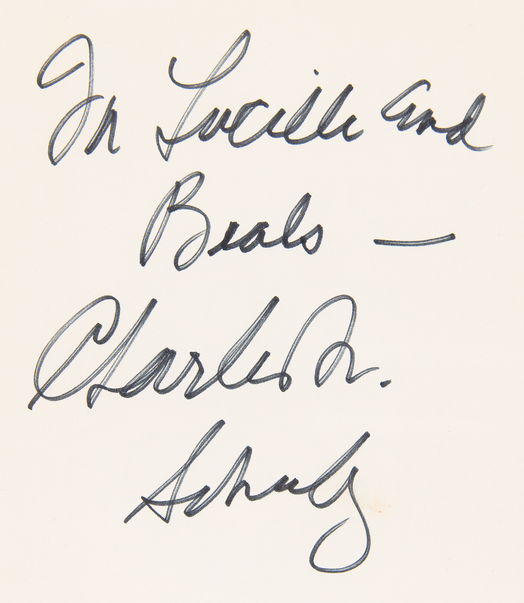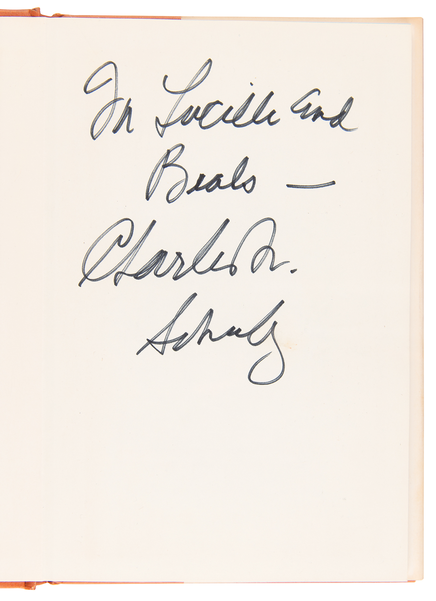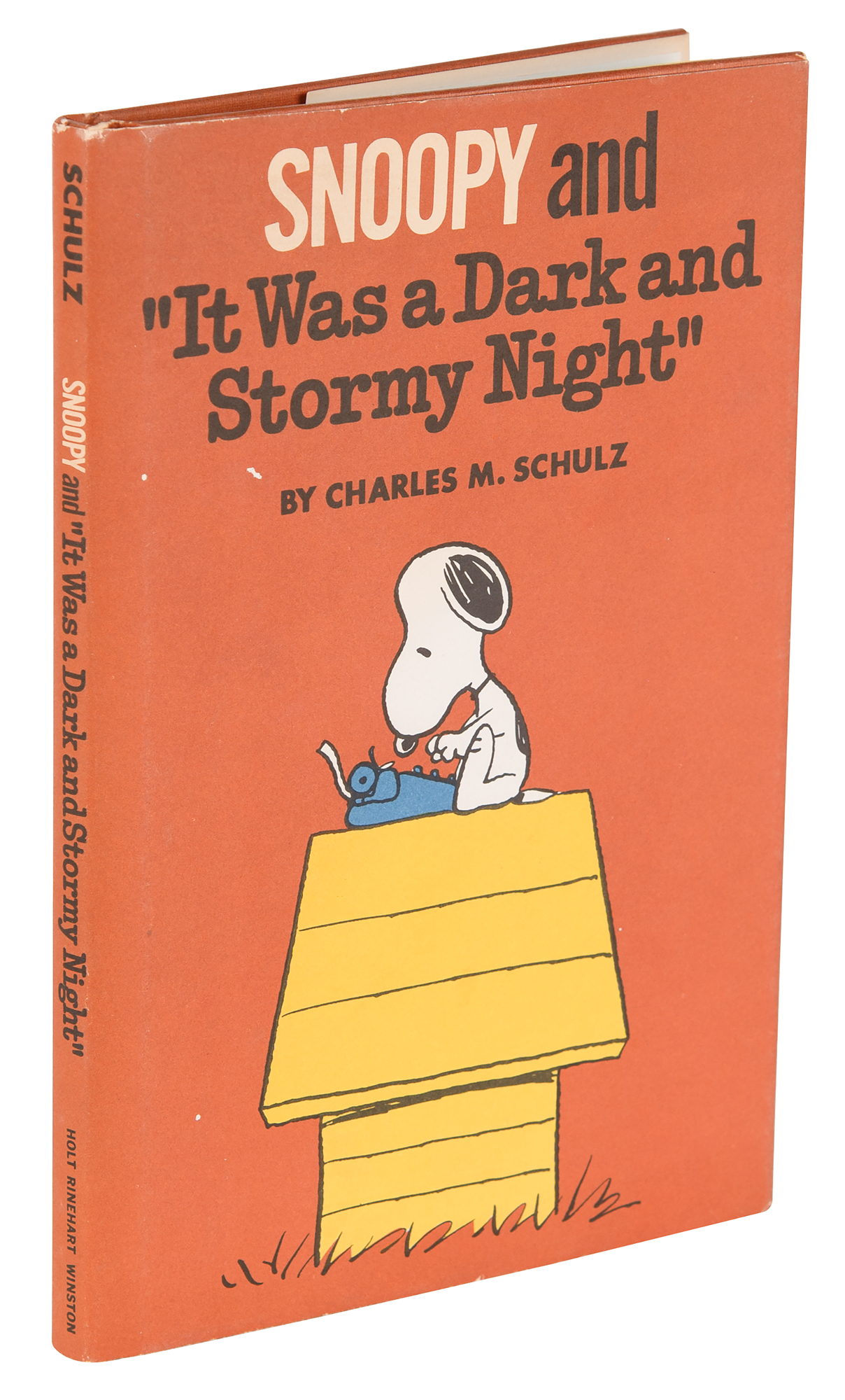 Signed book: Snoopy and 'It Was a Dark and Stormy Night.' First edition. NY: Holt, Rinehart and Winston, 1971. Hardcover with dust jacket, 5.5 x 8.25, 65 pages. Signed and inscribed on the first free end page in black felt tip, "For Lucille and Beals—Charles M. Schulz." In fine to very fine condition. Accompanied by a full letter of authenticity from JSA.