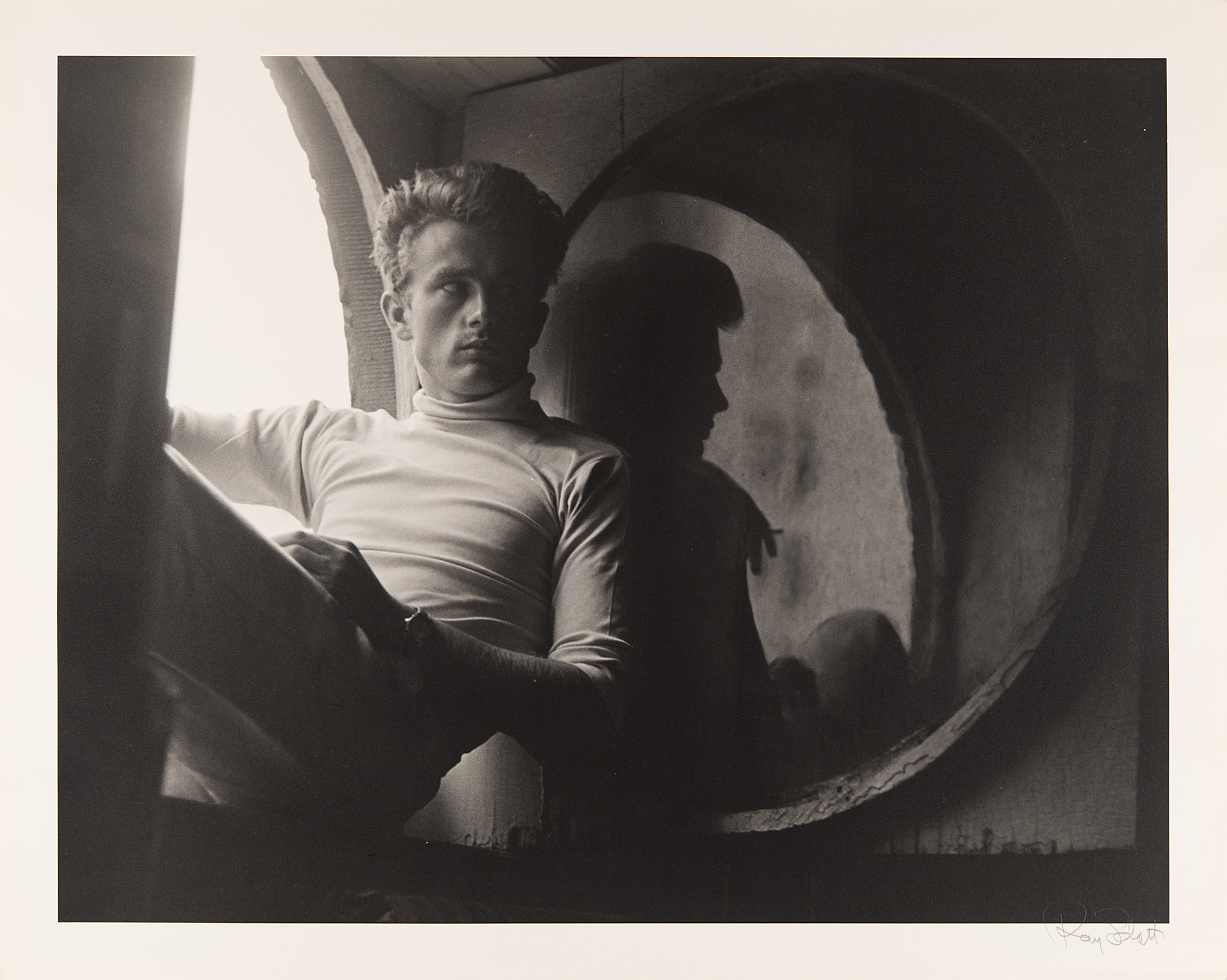 Original matte-finish 20 x 16 silver gelatin photograph of James Dean in the window of his apartment on West 68th Street in 1954, signed in the lower border in pencil by photographer Roy Schatt. Also stamped on the reverse with Schatt's credit. In fine condition, with minor edge rippling and a small edge crease below the signature. This image was chosen for display at the Smithsonian Institution's National Portrait Gallery.