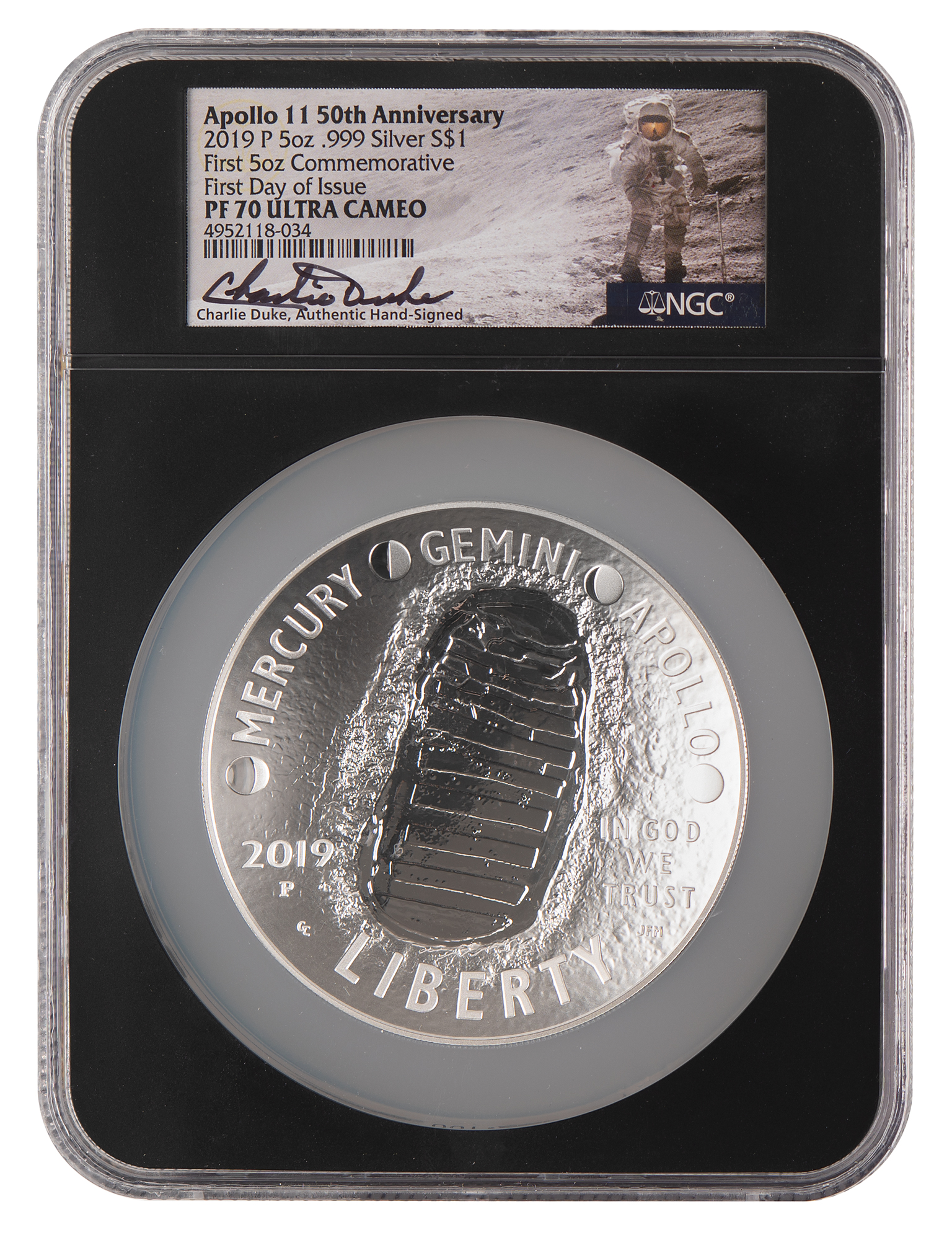 Gorgeous five-ounce proof silver dollar coin honoring the 50th anniversary of the Apollo 11 mission, encapsulated and graded by NGC as "PF 70 Ultra Cameo," and signed on the label in black felt tip by the Apollo 11 CAPCOM and Apollo 16 moonwalker Charlie Dule. The .999 silver coin measures 3˝ in diameter, with the convex front showing a gorgeous design of a lunar EVA with text, “United States of America, One Dollar, E Pluribus Unum,” and the concave reverse featuring the first lunar bootprint with raised text: “Mercury, Gemini, Apollo, 2019, Liberty, In God We Trust.” The impressive coin was issued by the United States Mint in 2019.