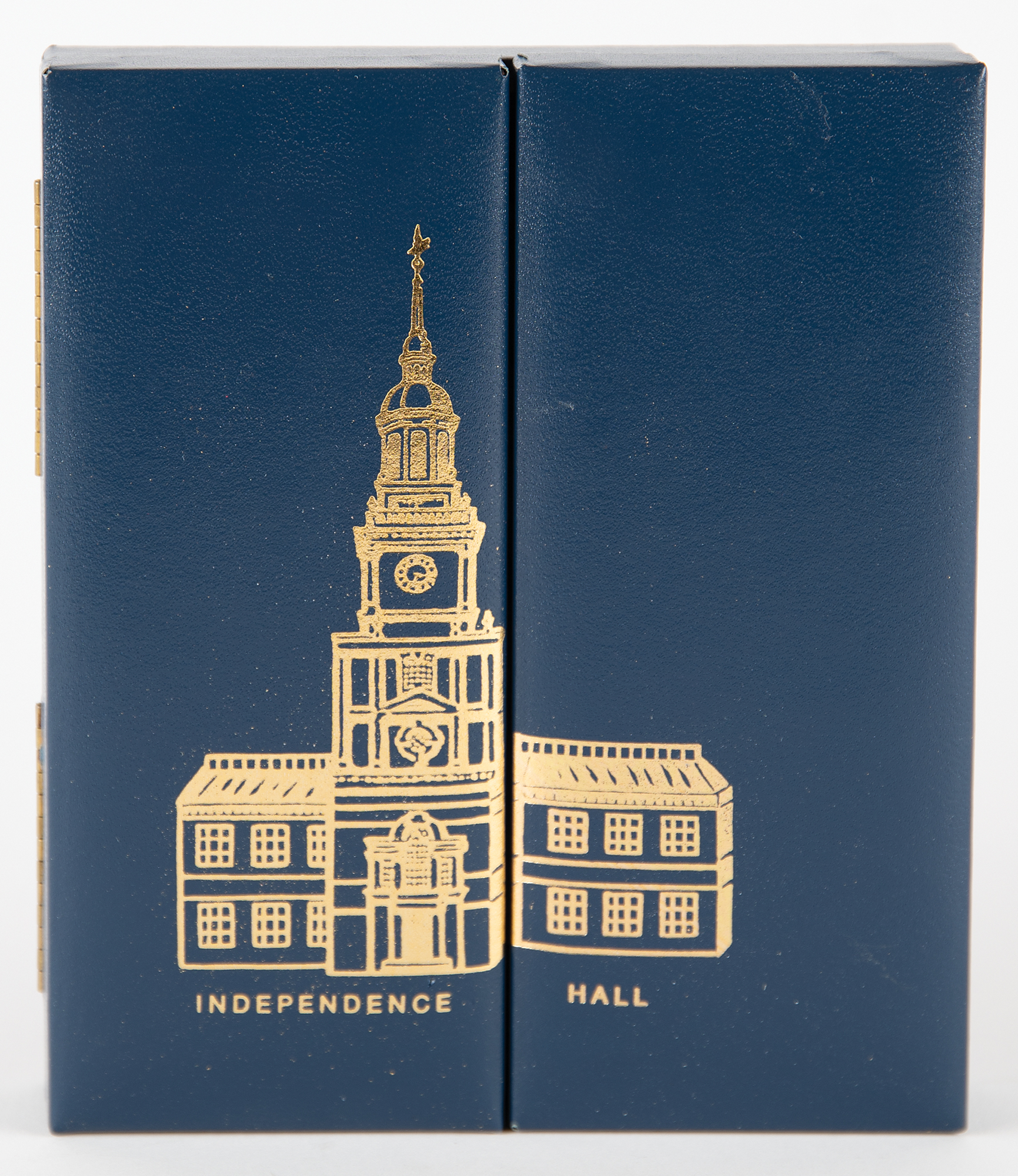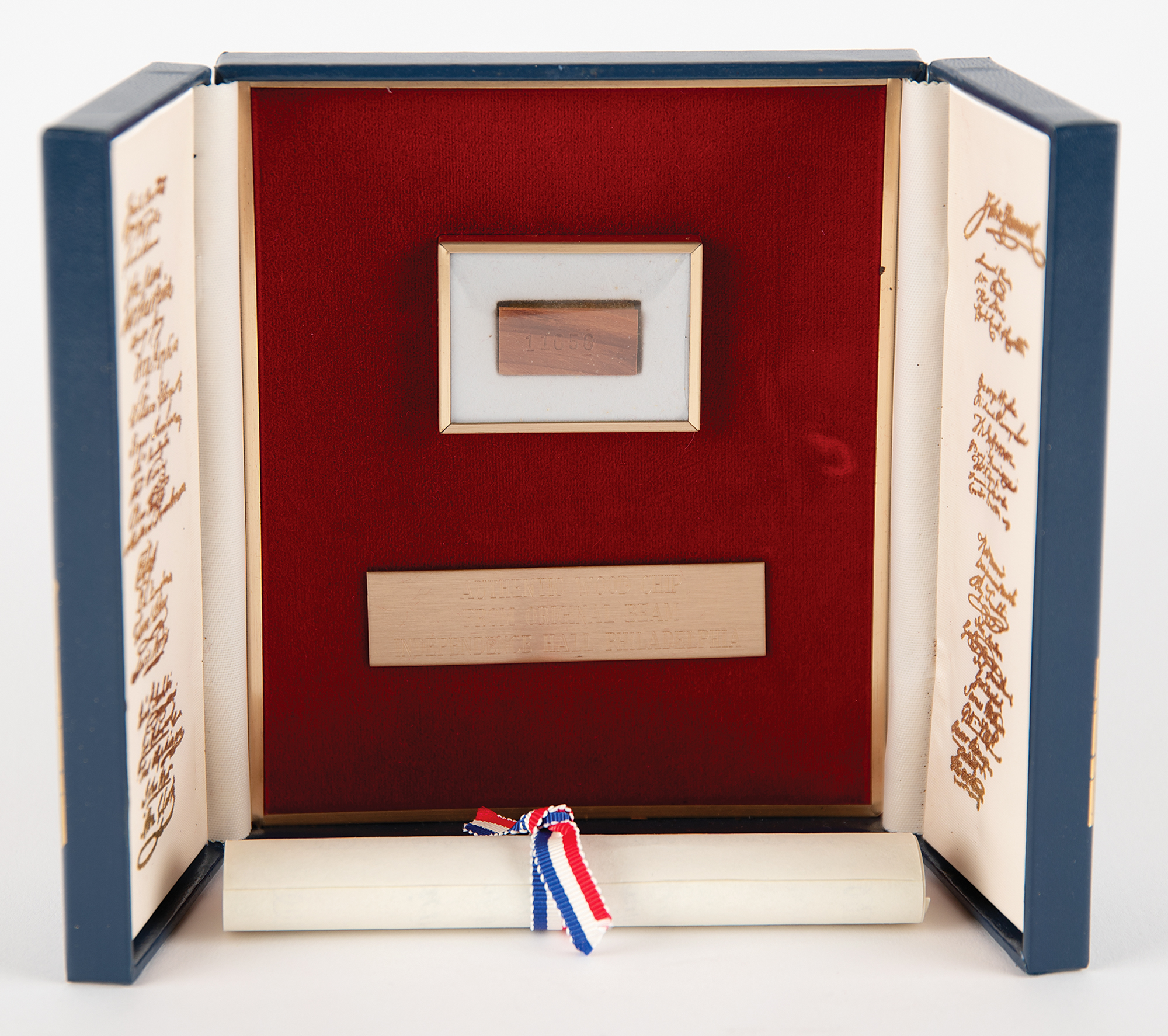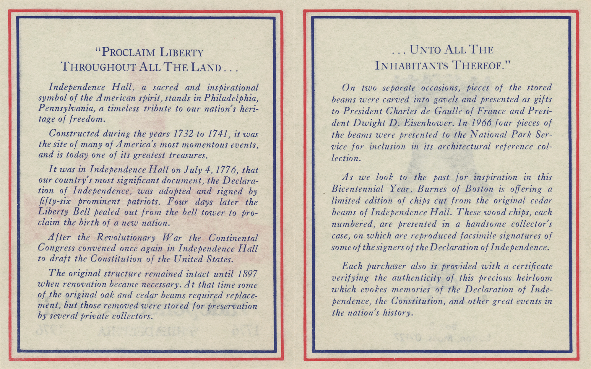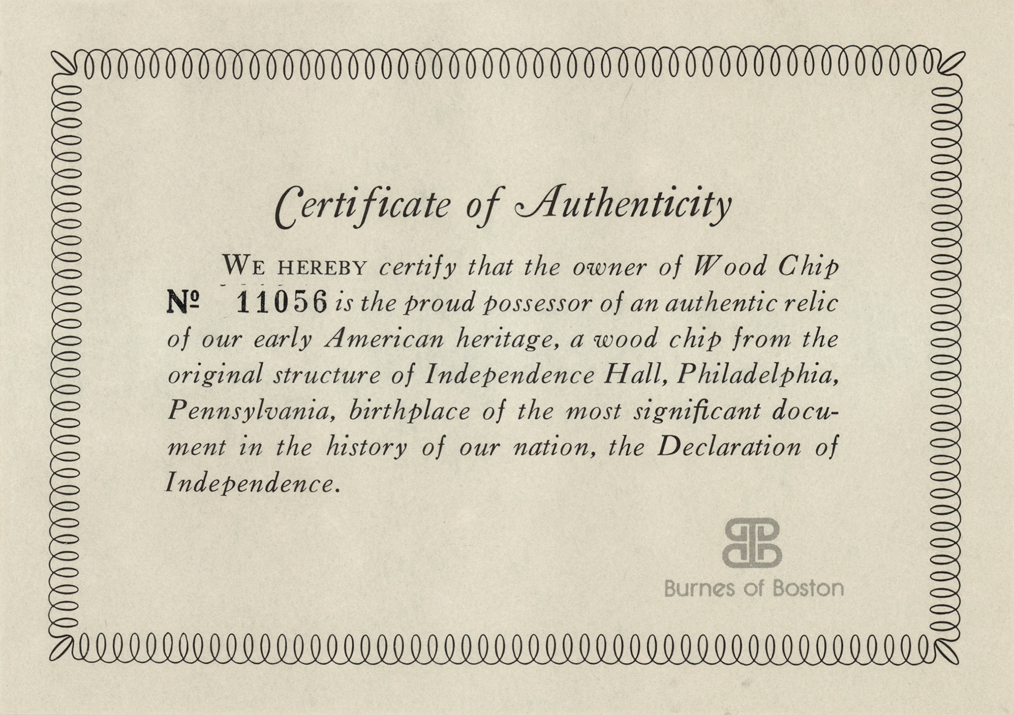 Limited edition display housing a 1 x .5 wood chip cut from the original cedar beams of Independence Hall in Philadelphia, numbered 11056 of an unspecified edition. Housed in a collector's case with an identification plaque and gold facsimile signatures of some of the signers of the Declaration of Independence. Accompanied by a certificate from Burnes of Boston, who released the edition during the bicentennial year of 1976.