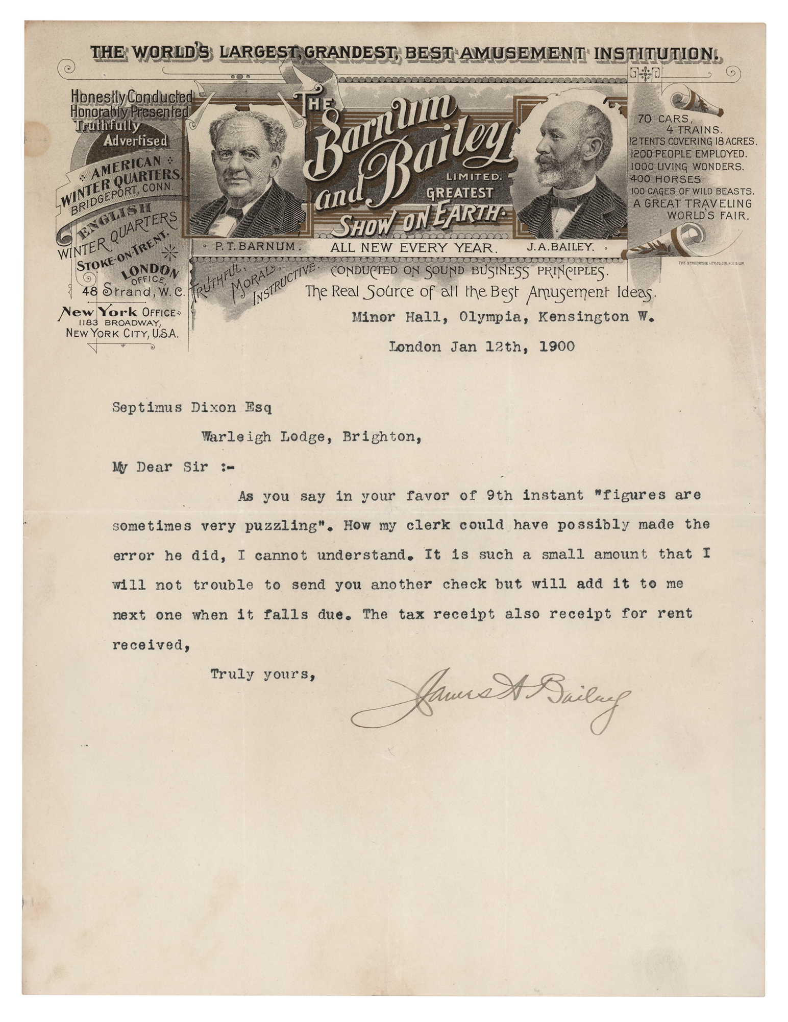 American showman (1847–1906) best known as a partner in Barnum and Bailey's circus. TLS signed "James A. Bailey," one page, 8.25 x 10.75, ornate, information-laden, and visually striking Barnum and Bailey Greatest Show on Earth letterhead, January 12, 1900. Letter to Septimus Dixon. In part: "As you say in your favor of 9th instant 'figures are sometimes very puzzling.' How my clerk could have possibly made the error he did, I cannot understand. It is such a small amount that I will not trouble to send you another check but will add it to me [sic] next one when it falls due." In fine condition, with some light creasing to the upper right corner. In addition to the stunning letterhead, this features Bailey's uncommon full signature—he generally signed using only his initials.