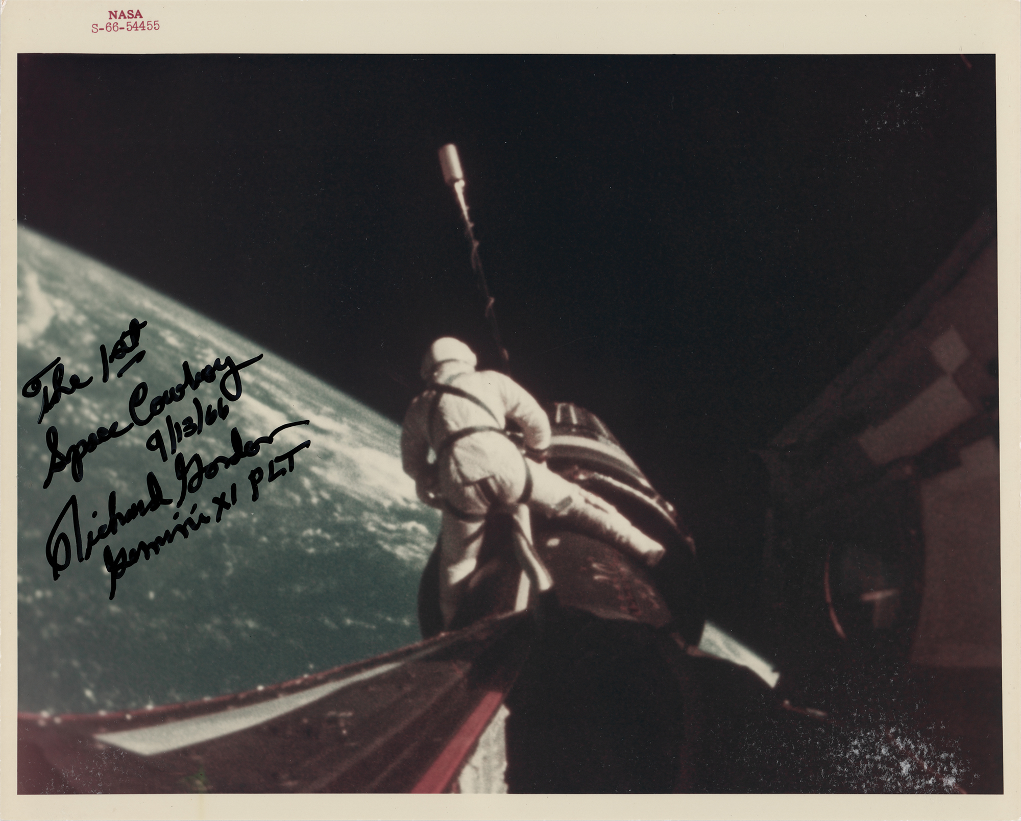 Fantastic original color glossy 8 x 10 red-numbered 'Type 1' NASA photo (S-66-54455) of Richard Gordon attaching a tether line from the Gemini XI spacecraft to the Agena Target Docking Vehicle during an EVA, nicely signed in black felt tip, "The 1st Space Cowboy, 9/13/66, Richard Gordon, Gemini XI PLT." Reverse bears purple NASA caption text and “A Kodak Paper” watermarks. In very good to fine condition, with surface scuffing to the lower right corner.
