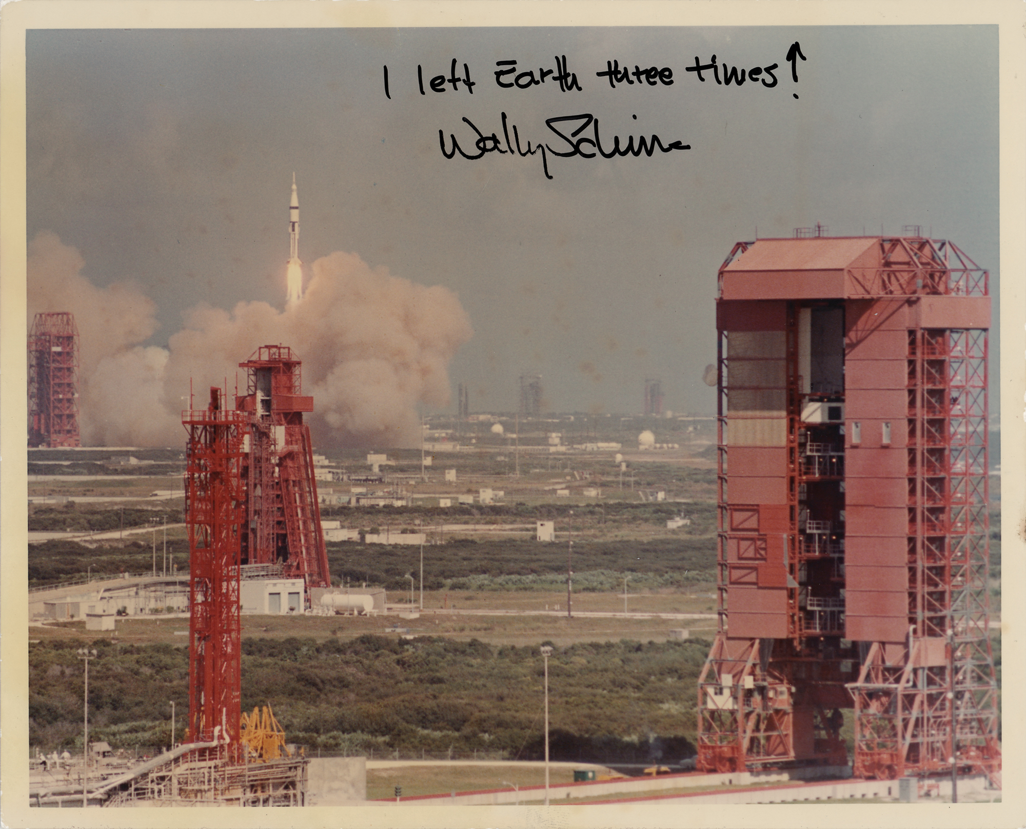 Original color glossy 10 x 8 NASA photo of the Apollo 7 liftoff, signed in black felt tip, "I left Earth three times! Wally Schirra." Reverse bears purple NASA caption text and “A Kodak Paper” watermarks. In very good to fine condition, with small creases and some light surface spotting.