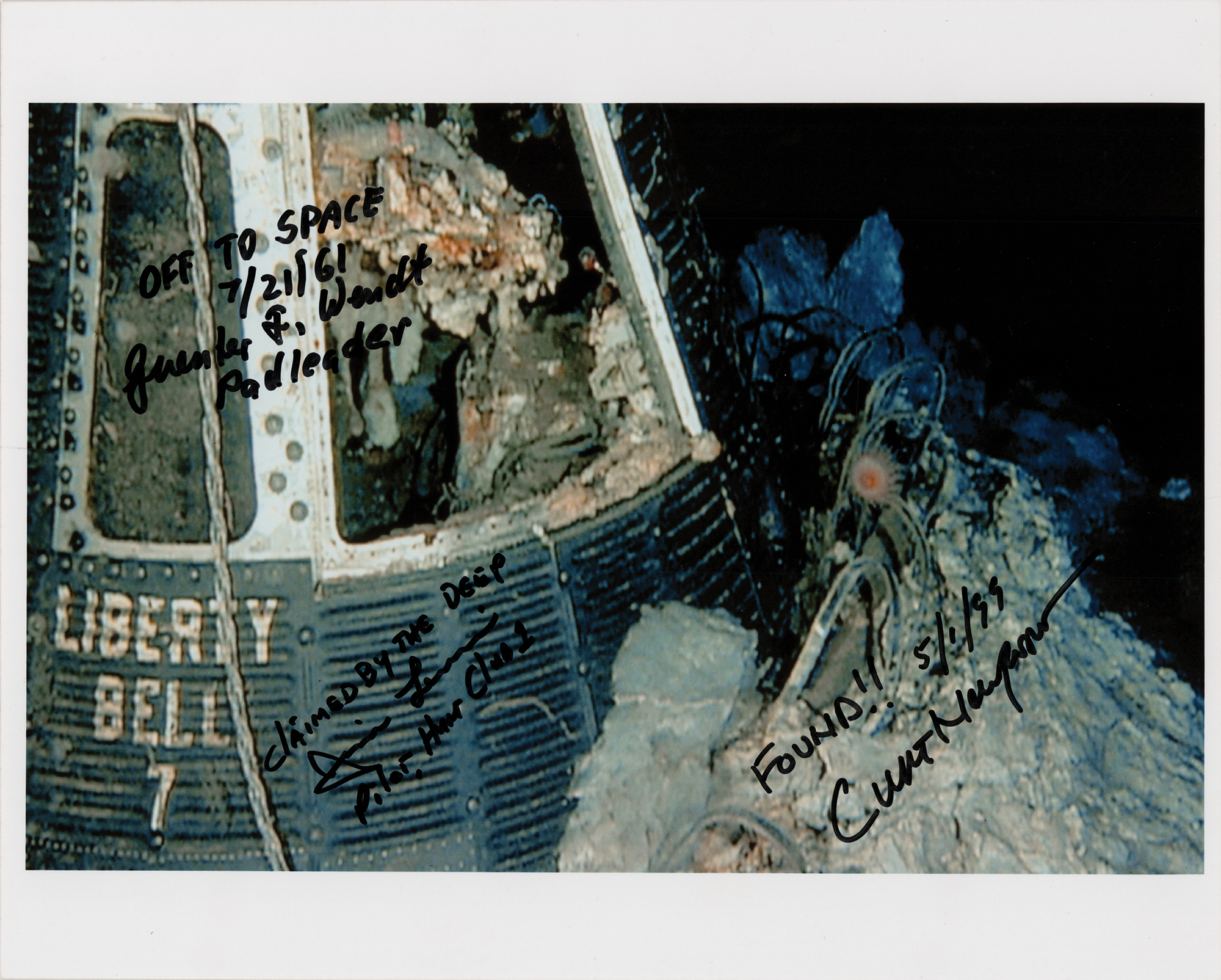 Color satin-finish 10 x 8 photo of the Liberty Bell 7 capsule at the bottom of the ocean, signed in black felt tip, "Off to space, 7/21/61, Guenter F. Wendt Padleader," "Claimed by the deep, Jim Lewis, Pilot, Hunt Club 1," and "Found!! 5/1/99, Curt Newport." In very fine condition.