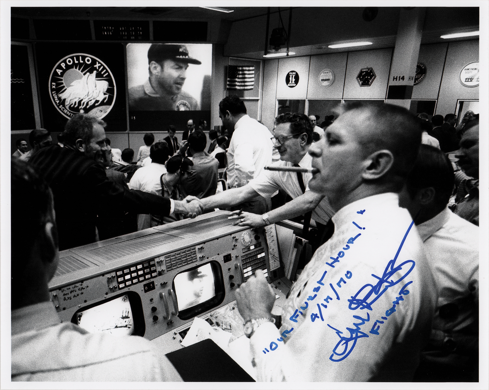 Glossy 10 x 8 photo of Gene Kranz lighting up a celebratory cigar as he watches CDR James Lovell on a monitor after the successful Apollo 13 recovery, signed in blue felt tip, “‘Our Finest Hour!’ 4/17/70, Eugene F. Kranz, Flight.” In very fine condition.