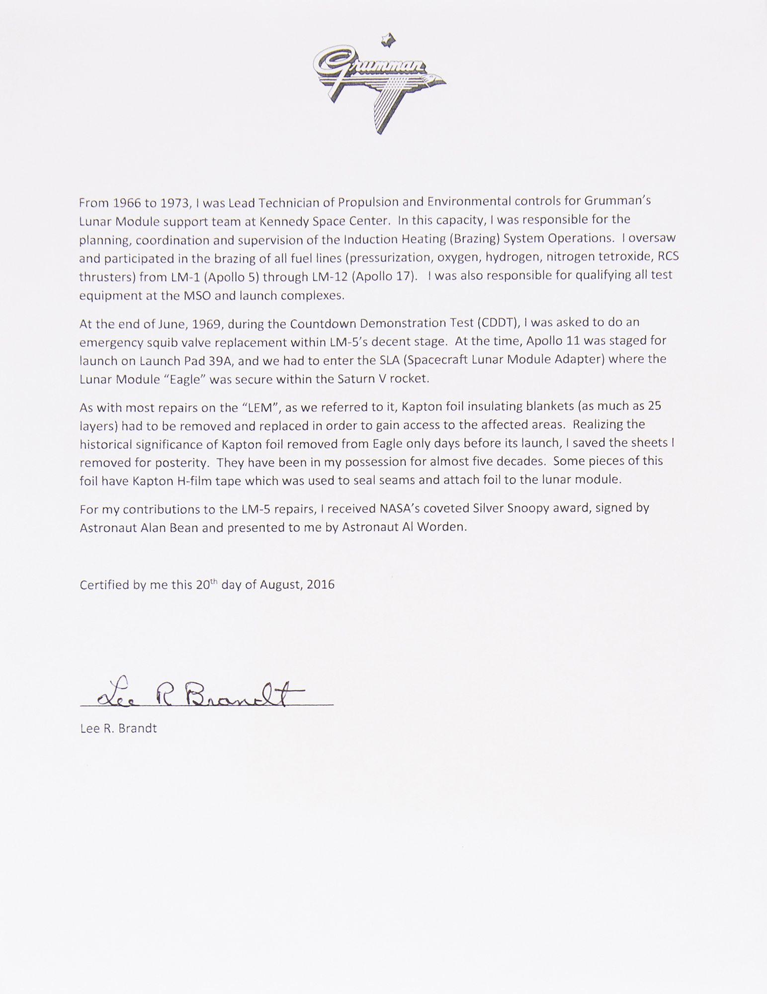 Accompanied by a letter of provenance from Lee R. Brandt, the lead technician of Propulsion and Environmental controls for Grumman's lunar module support team at the Kennedy Space Center, who notes: "At the end of June, 1969, during the Countdown Demonstration Test…I was asked to do an emergency squib valve replacement within LM-5's descent stage. At the time, Apollo 11 was staged for launch on Launch Pad 39A, and we had to enter the SLA…where the Lunar Module 'Eagle' was secure within the Saturn V rocket. As with most repairs on the 'LEM,' as we referred to it, Kapton foil insulating blankets (as much as 25 layers) had to be removed and replaced in order to gain access to the affected areas. Realizing the historical significance of Kapton foil removed from Eagle only days before its launch, I saved the sheets I removed for posterity…For my contributions to the LM-5 repairs, I received NASA's coveted Silver Snoopy award." Also accompanied by a copy of a letter from future Apollo 12 moonwalker Alan Bean, conveying to Brandt the referenced 'Silver Snoopy' award.