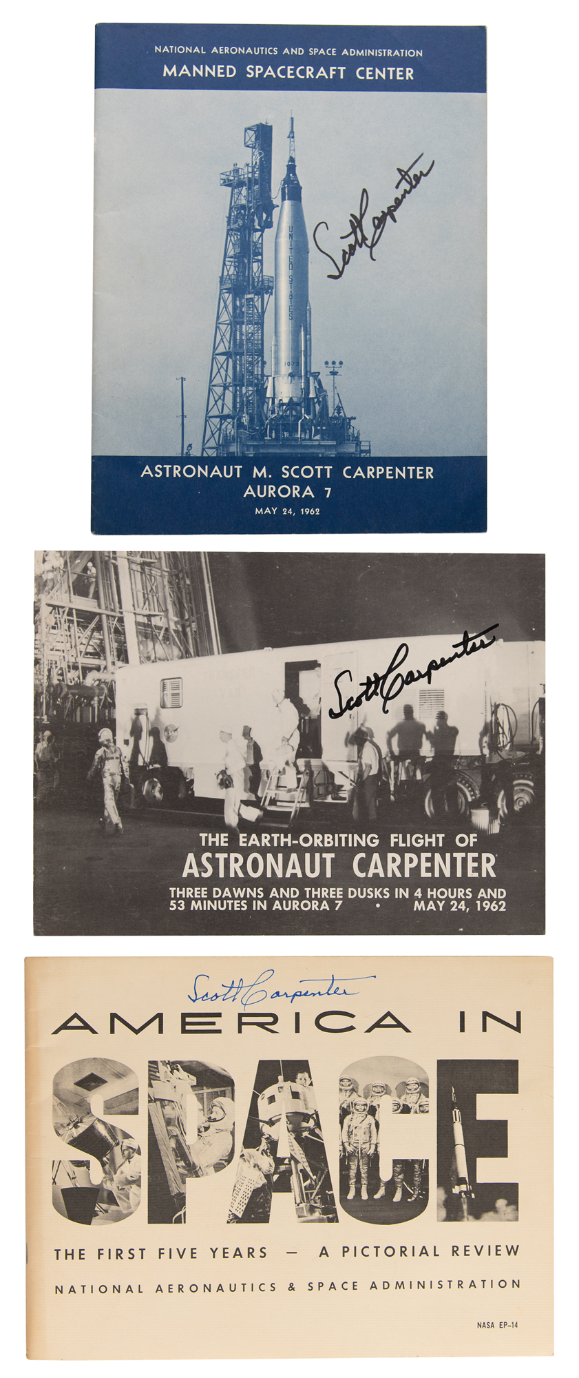 Three vintage booklets honoring the American space program and the Mercury-Atlas 7 mission, each signed on the front cover in blue ink or black felt tip by Aurora 7 pilot Scott Carpenter. Titles are as follows: America in Space: The First Five Years–A Pictorial Review (NASA), Astronaut M. Scott Carpenter, Aurora 7, May 24, 1962 (NASA), and The Earth-Orbiting Flight of Astronaut Carpenter. In overall fine condition.