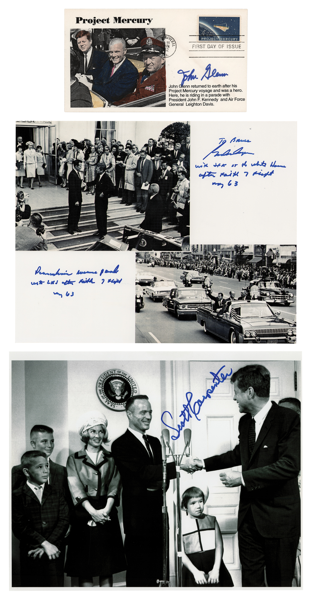 Three items signed by a Mercury astronaut and related to President John F. Kennedy: