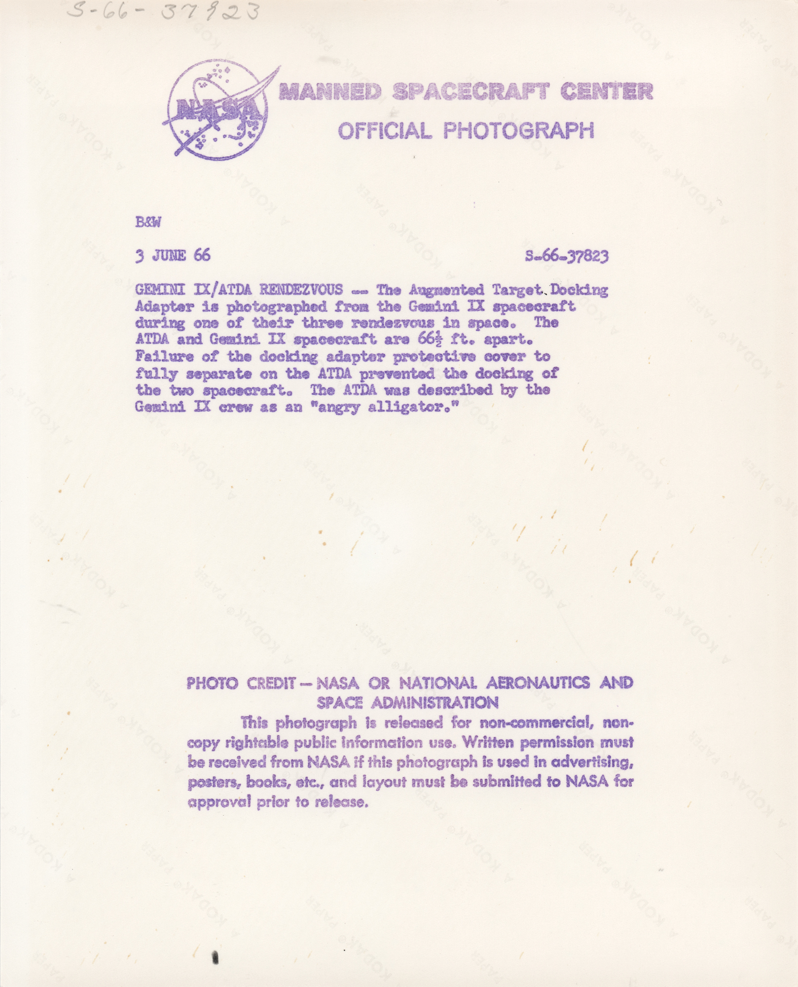 Official color glossy 10 x 8 NASA photo of the Augmented Target Docking Adapter as viewed from the Gemini IX spacecraft, signed and inscribed in black felt tip, “To Bruce – Best wishes, Gene Cernan” and “Tom Stafford.” The reverse bears purple NASA caption text. In very fine condition.