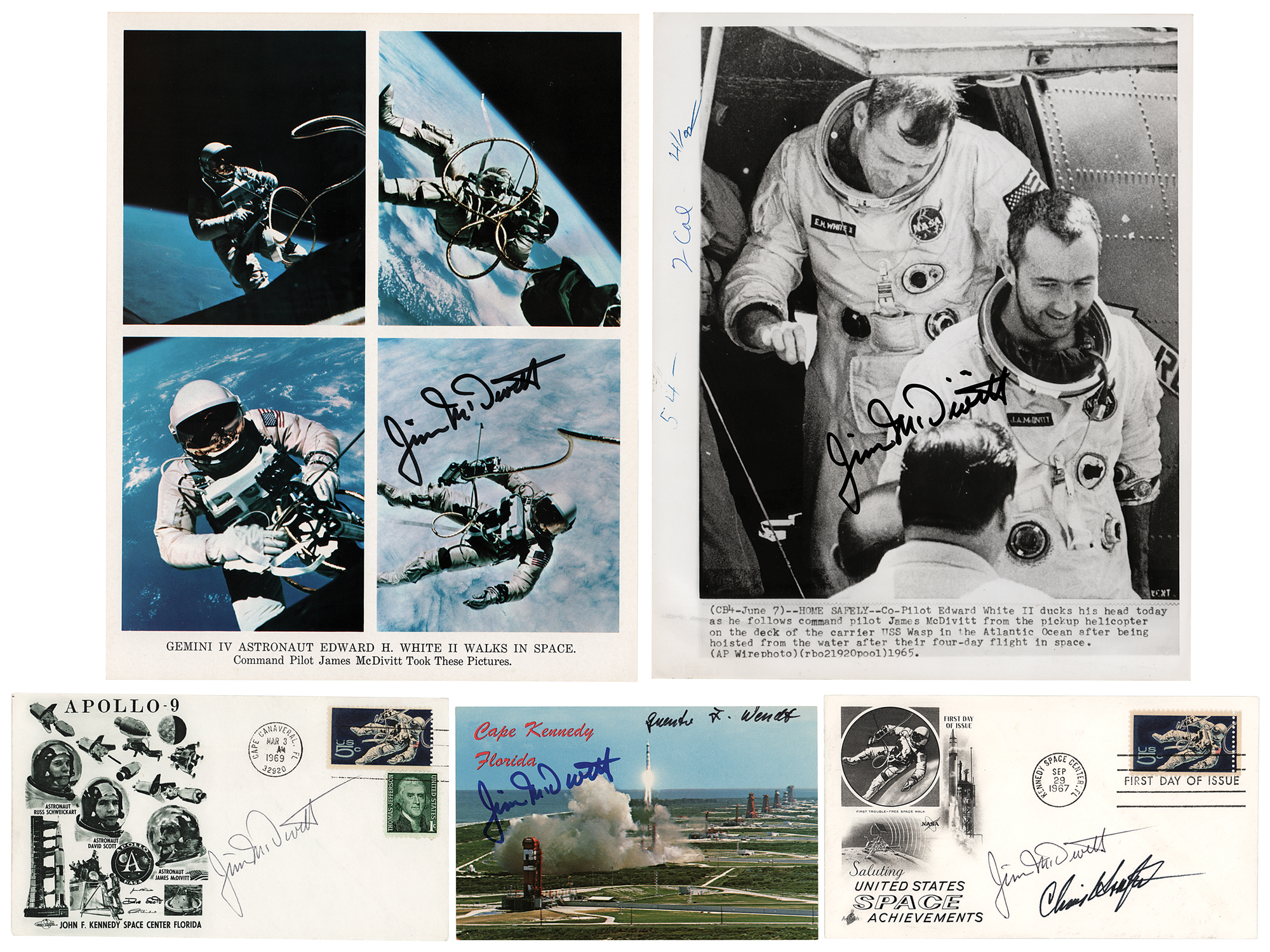 Five items signed in ballpoint or felt tip by Jim McDivitt: an official glossy NASA 8 x 10 photo of the Gemini 4 crew walking onto the deck of the recovery ship USS Wasp; an official color 8 x 10 NASA lithograph of four images honoring the Gemini 4 mission; a color glossy 5.5 x 3.5 postcard photo of a Titan rocket launch, which is also signed by pad leader Guenter Wendt; an FDC with a cachet honoring American space achievements, which is also signed in black felt tip by NASA flight director Christopher Kraft; and a commemorative ‘launch day’ cover with a cachet honoring the Apollo 9 mission, postmarked on March 3, 1969. In overall fine condition.