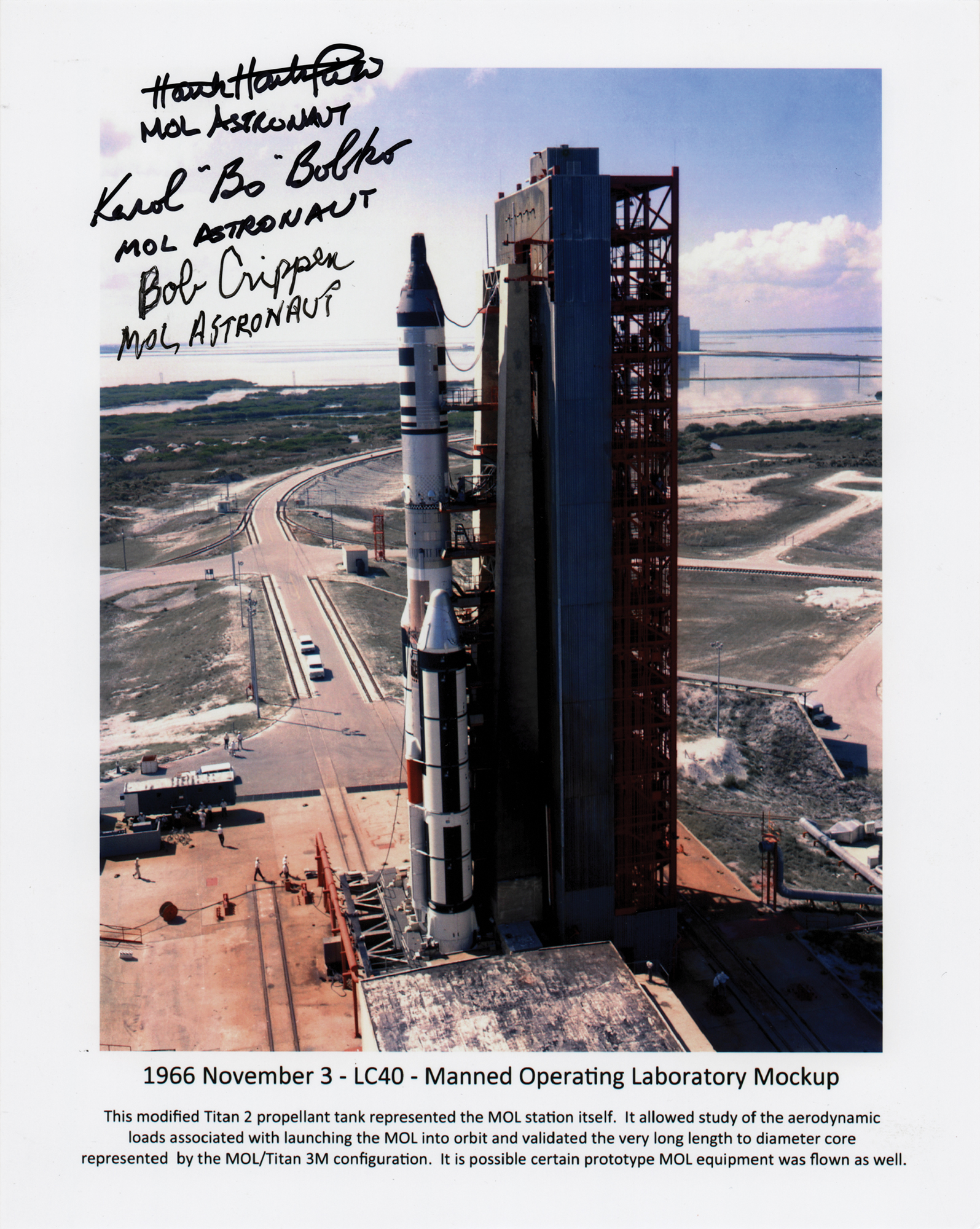 Color glossy 8 x 10 photo of the MOL mockup that launched from the Cape Canaveral Space Launch Complex 40 on November 3, 1966, signed in black felt tip by three of the program’s astronauts: “Hank Hartsfield, MOL Astronaut,” “Karol ‘Bo’ Bobko, MOL Astronaut,” and “Bob Crippen, MOL Astronaut.” Includes a TLS postcard from Crippen agreeing to sign the photograph. In fine condition.