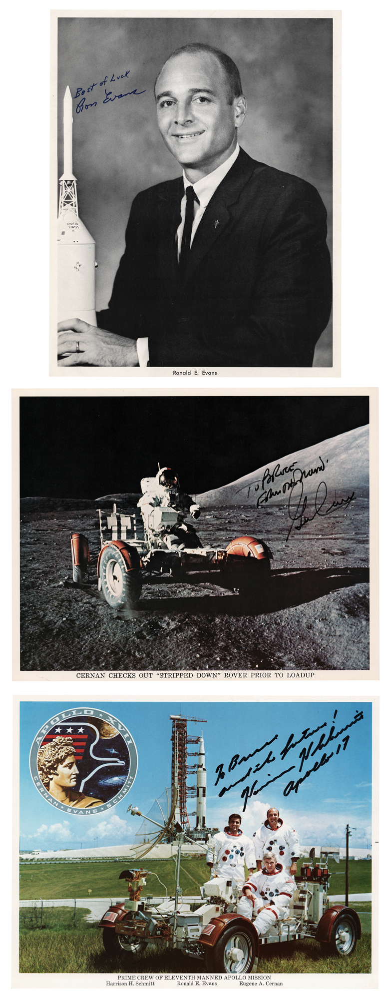 Three official NASA lithographs honoring the Apollo 17 mission: a color 10 x 8 photo of CDR Cernan riding the lunar rover during an EVA, signed and inscribed in black felt tip, “To Bruce, From the moon, Gene Cernan”; a color 10 x 8 photo of the Apollo 17 crew posing outside in their white space suits, signed and inscribed in black felt tip, “To Bruce and the future! Harrison H. Schmitt, Apollo 17”; and an 8 x 10 portrait photo of Ron Evans posing with a model, signed in blue felt tip, “Best of luck, Ron Evans.” In overall fine condition.