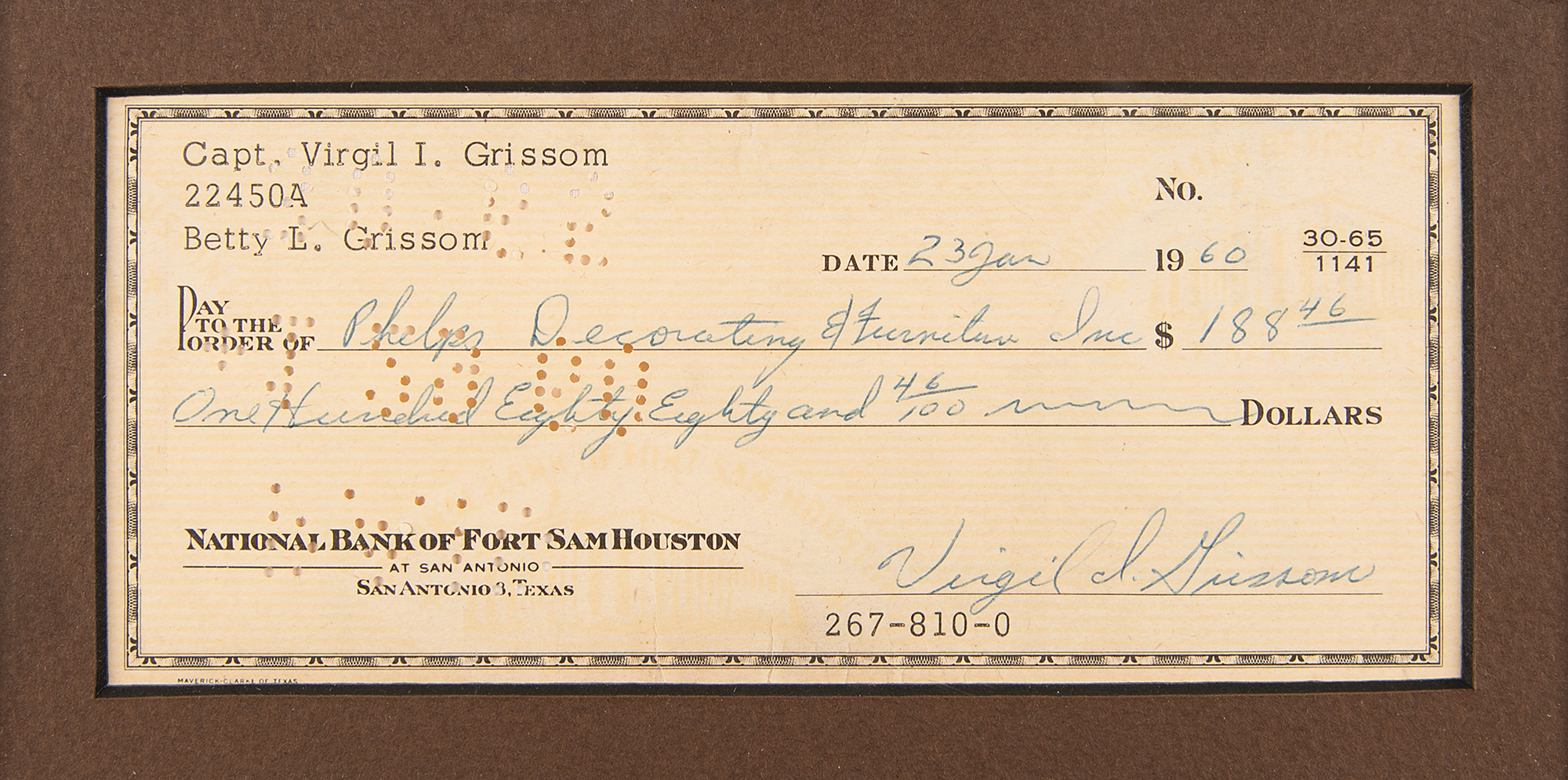 Personal check, 6 x 2.75, filled out and signed by Grissom, "Virgil I. Grissom," payable to Phelps Decorating & Furniture Inc. for $188.46, January 23, 1960. Nicely double-matted and framed with a portrait to an overall size of 13 x 16. In fine condition.