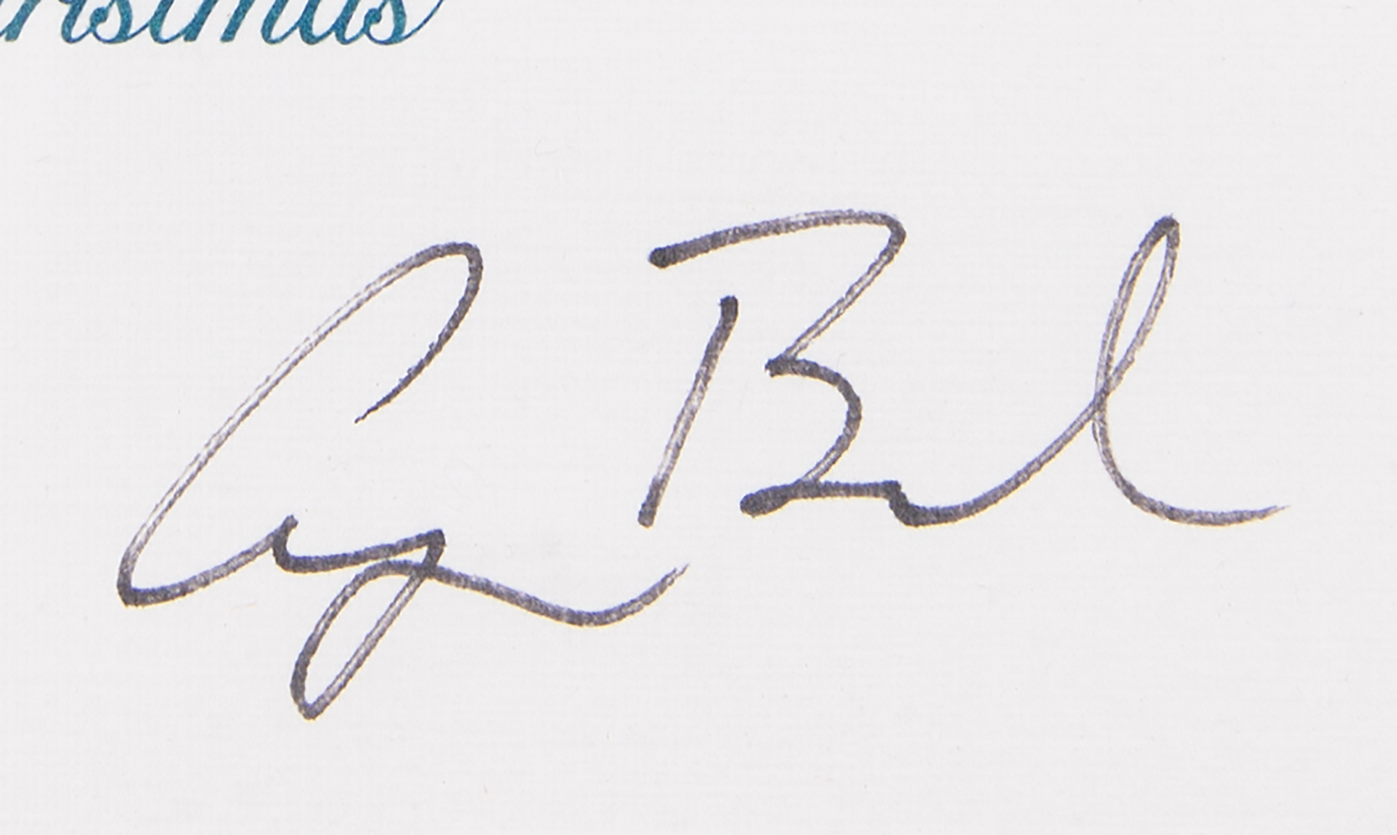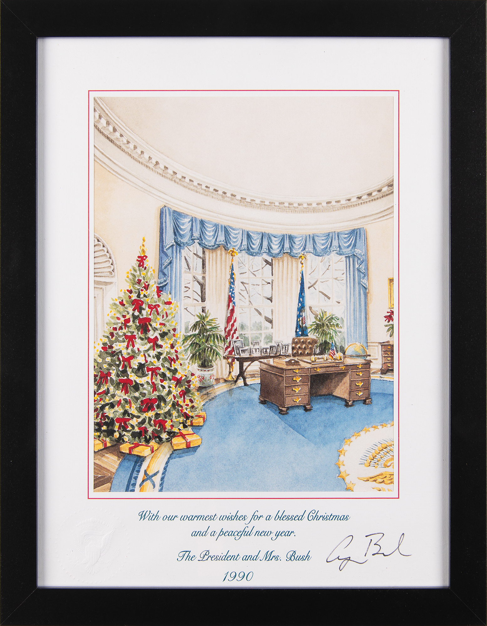 Attractive White House Christmas card from 1990, 9.5 x 12.5, signed in the lower right corner in black felt tip by George Bush. Embossed in the lower left with the presidential seal. Framed to an overall size of 11.25 x 14.25. In very fine condition.