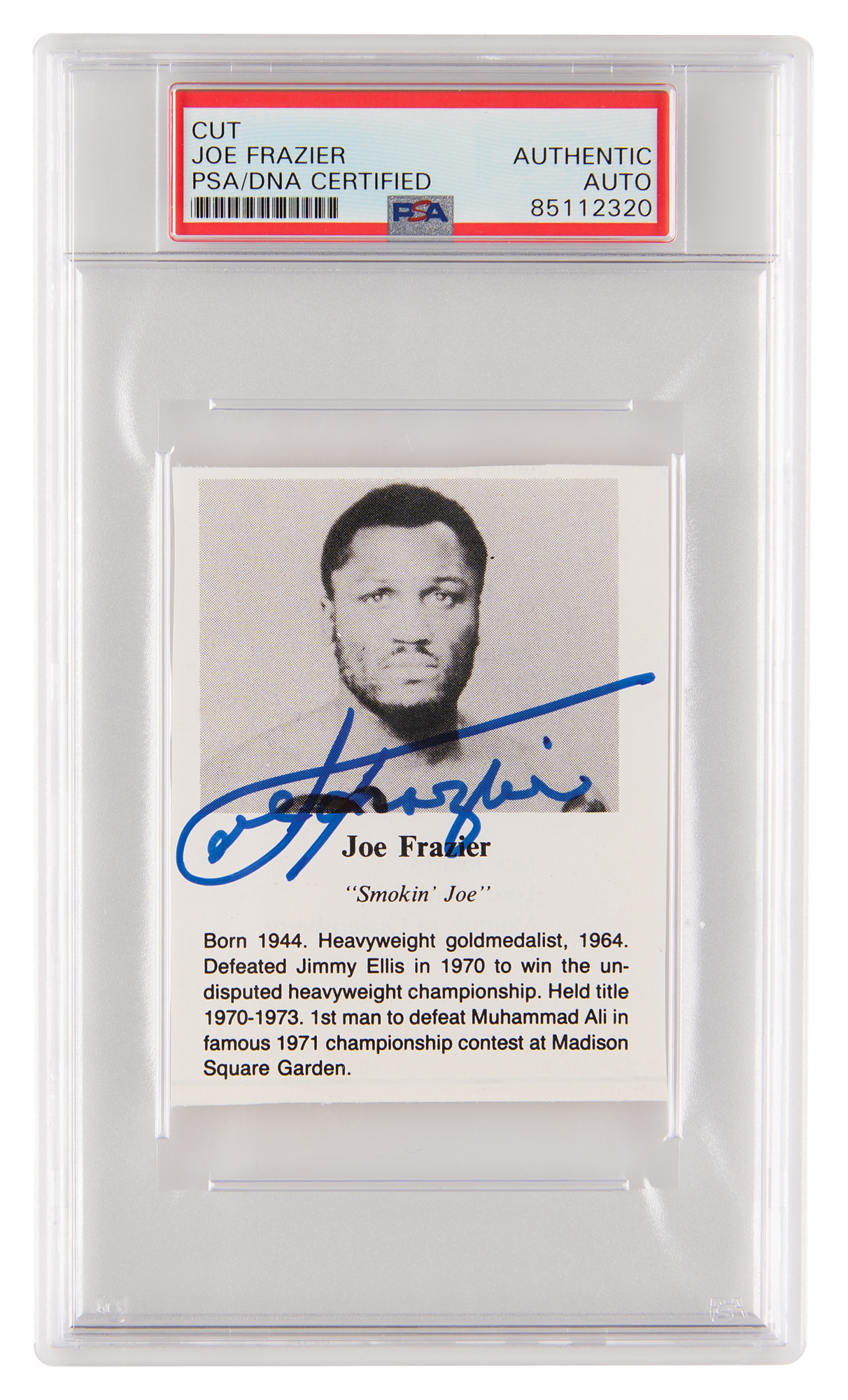 Clipped 2.75 x 3.5 program photo and biography of 'Smokin' Joe' Frazier, signed in blue felt tip by the heavyweight champ. In very fine condition. Encapsulated in a PSA/DNA authentication holder.