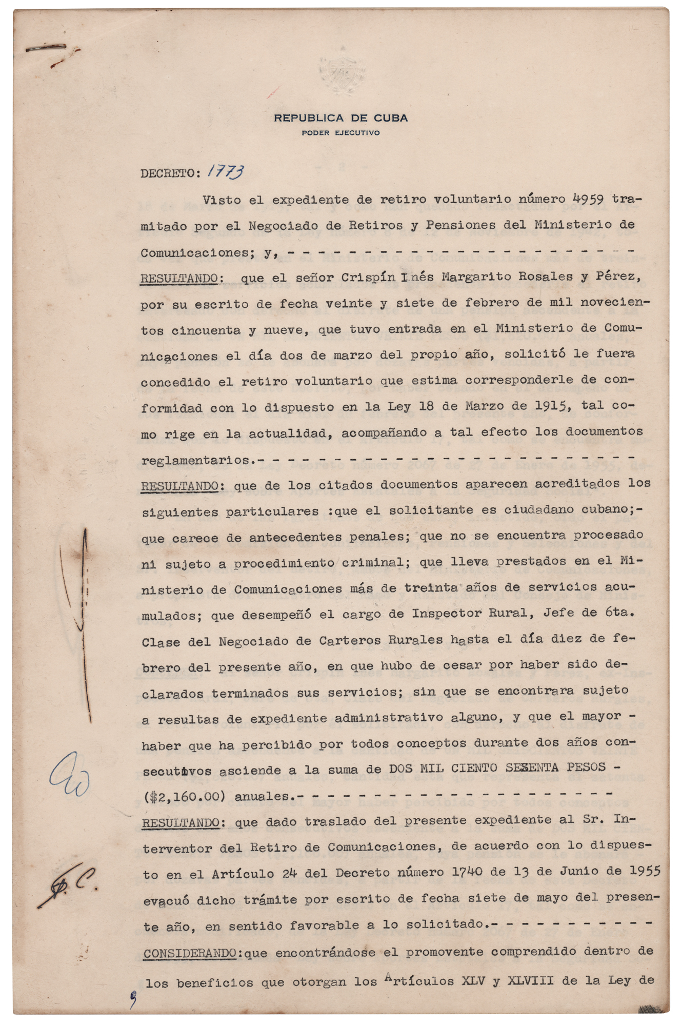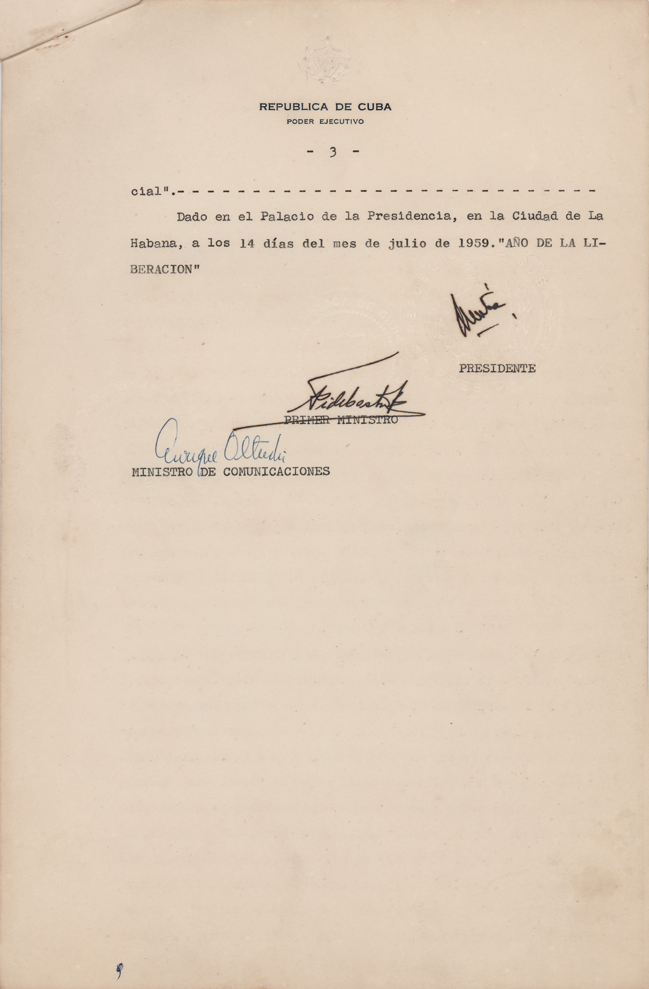 DS in Spanish, three pages, 8.5 x 13, July 14, 1959. Decree issued from the "Presidential Palace" in Havana, Cuba, in the "Año de la Liberacion [Year of the Liberation]," by which Prime Minister Fidel Castro grants an annual pension to a retiring mailman. Signed at the conclusion in ink by Prime Minister Fidel Castro, President Manuel Urrutia Lleó, and Minister of Communications Enrique Oltuski; the first two pages are also initialed in the margins by all three. In fine condition.
