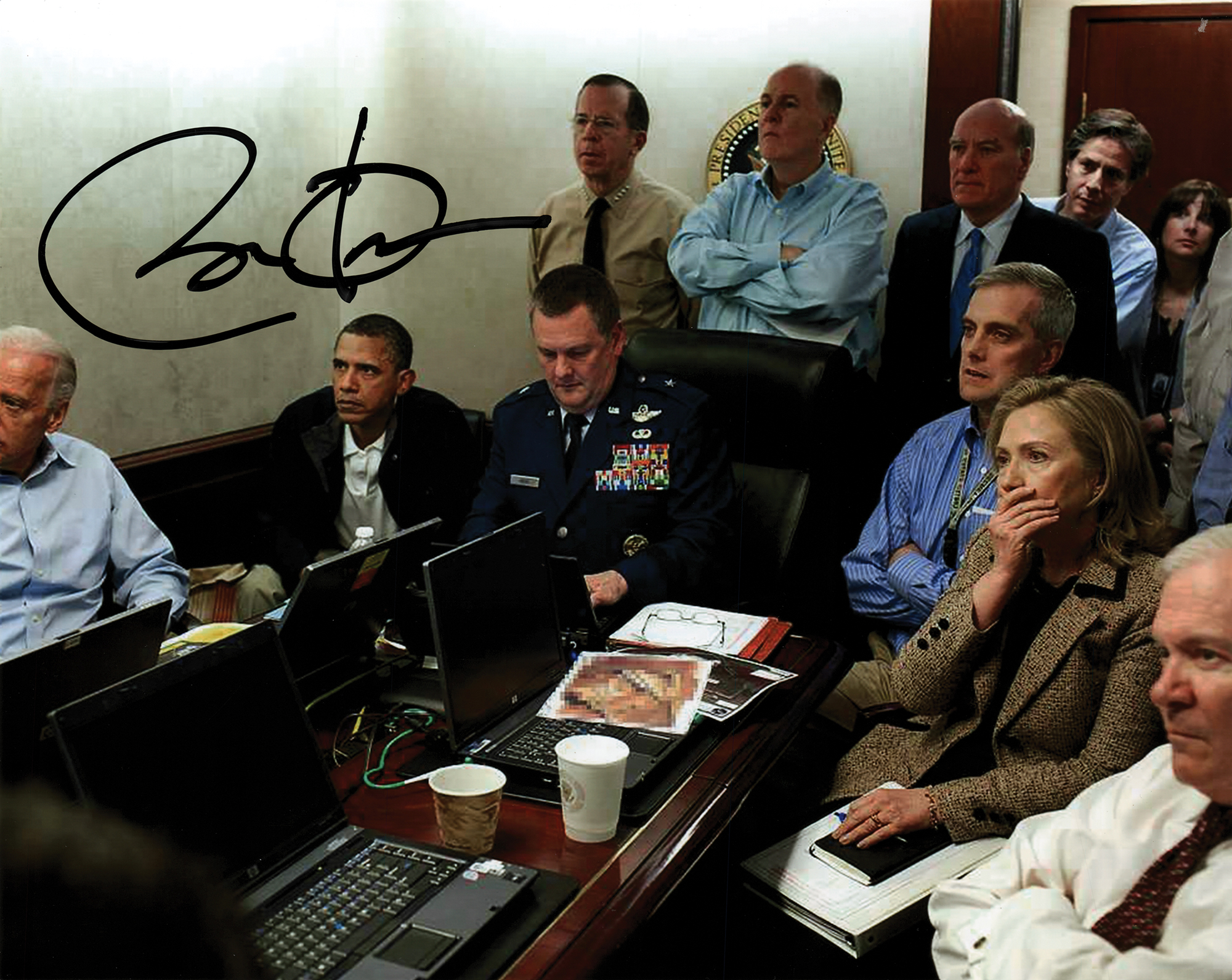 Color glossy 10 x 8 photo of the situation room during the raid on Osama bin Laden, signed in black felt tip by Barack Obama. In fine condition, with a slightly grainy quality to the image.