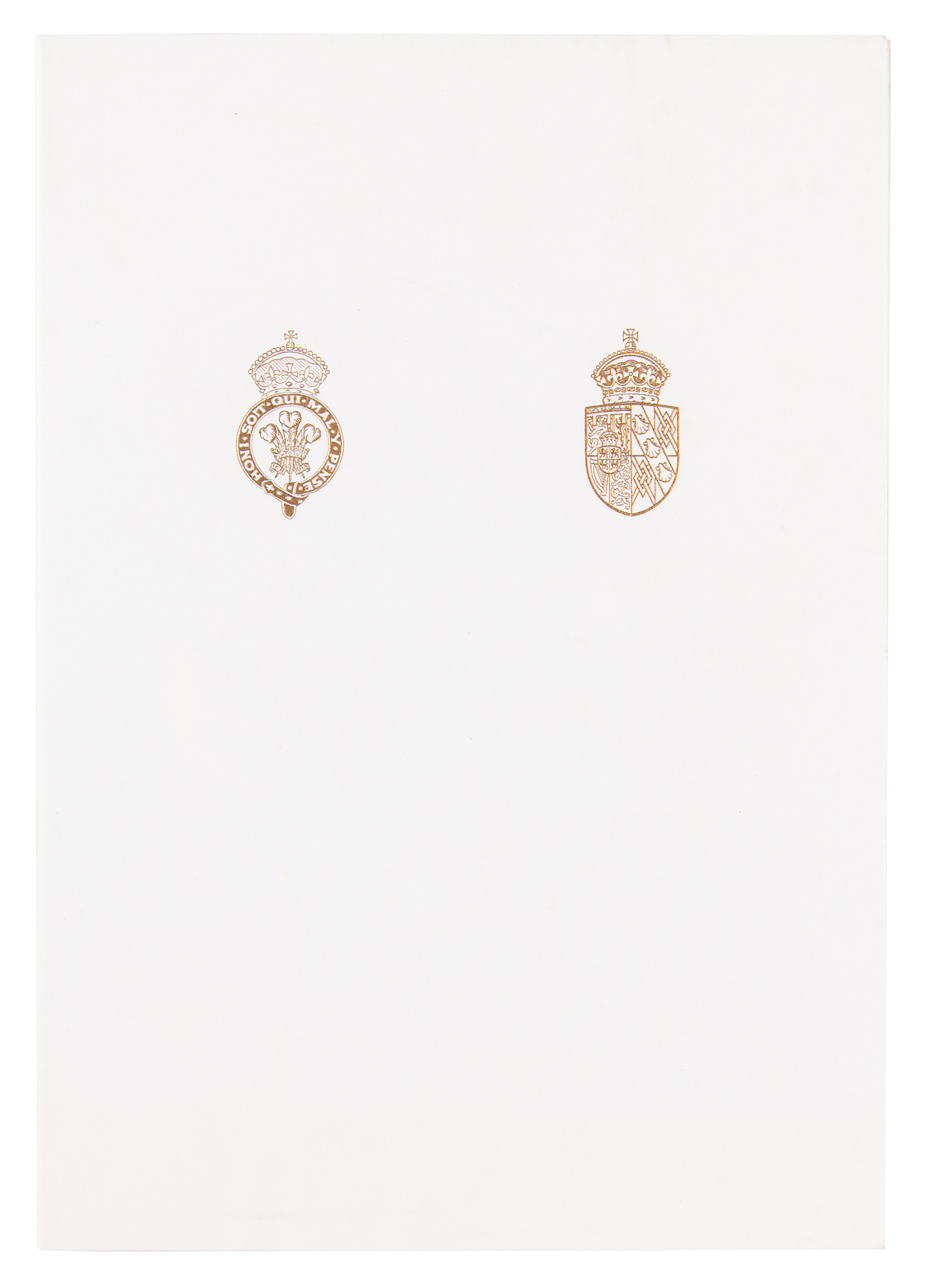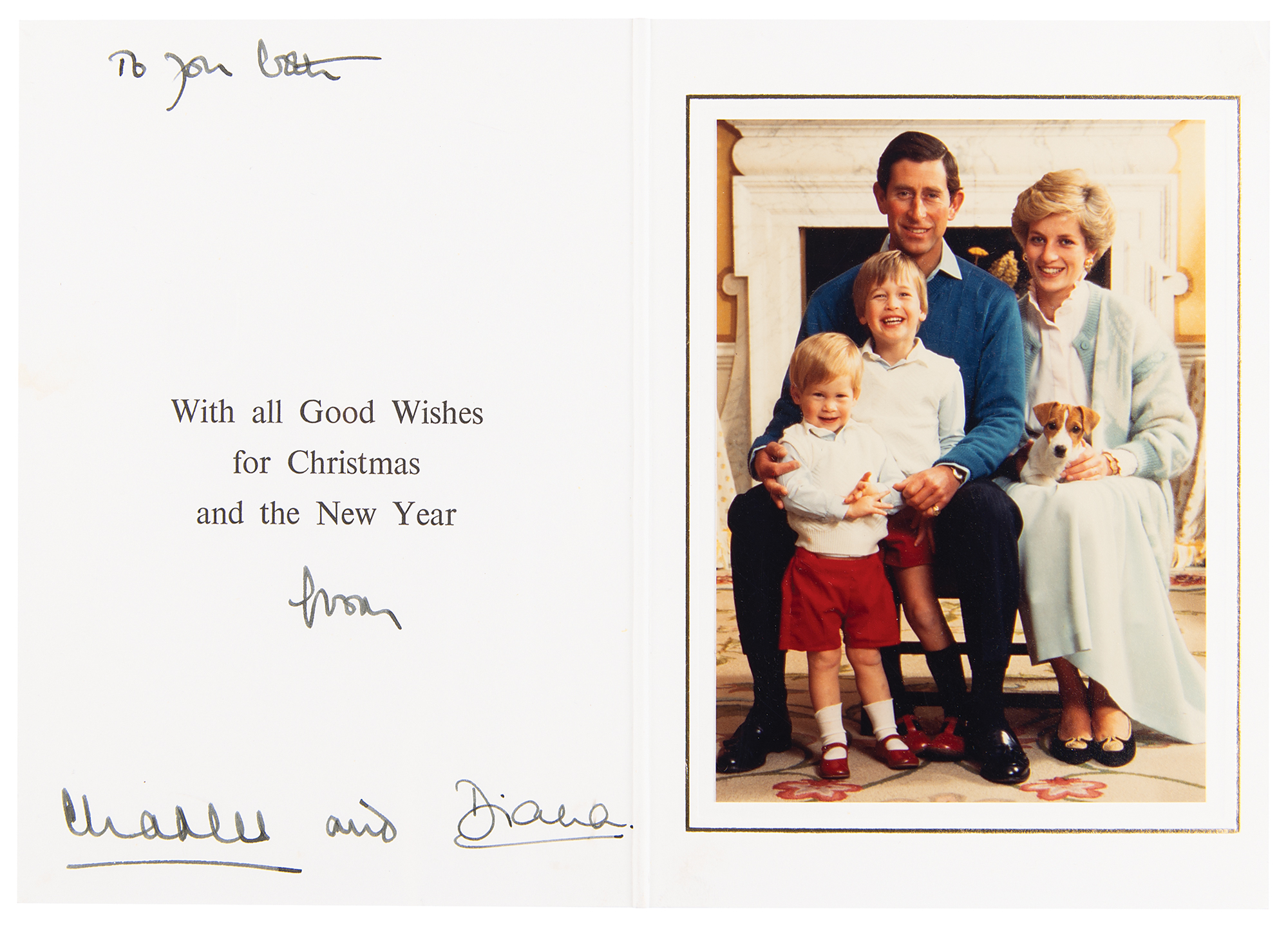 Appealing 1986 Christmas card embossed on the front with the Prince of Wales’s feathers and Order of the Garter motto and the Spencer family arms, measuring 10.25 x 7.25 open, featuring an affixed color photo of the royal couple posing with their young sons Prince William and Prince Harry, signed and inscribed in fountain pen, "To you both, from Charles and" and "Diana." In fine condition, with small stains on the outside back cover.