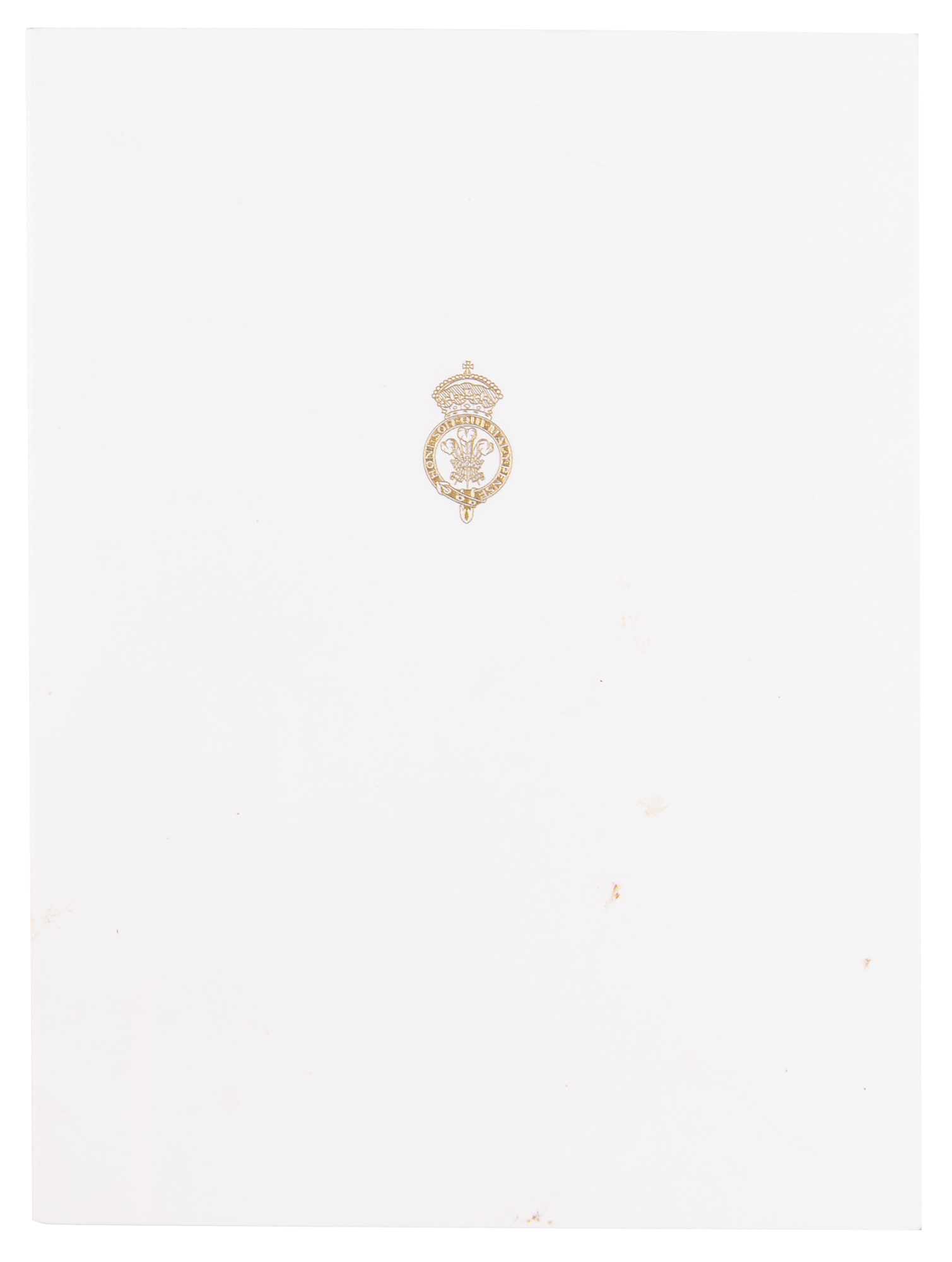 Christmas card from 1997 with the front bearing an embossed coat of arms, measuring 12 x 8 open, the inside featuring an affixed color photo of Charles with sons William and Harry on the deck of the Royal Yacht Britannia, signed and inscribed on the left side in fountain pen, "James—from Charles." In fine condition, with a few light stains to front cover.