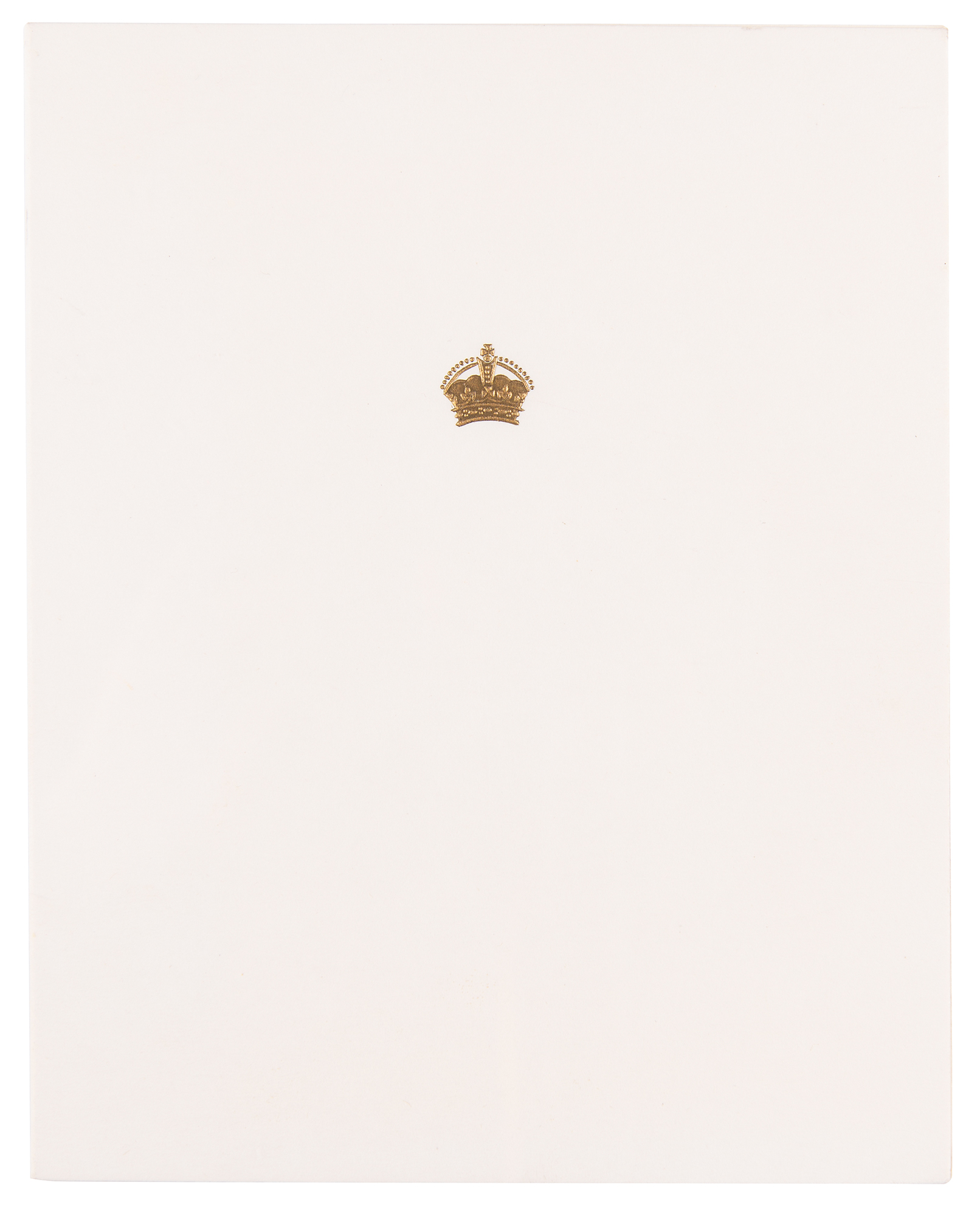 Christmas card from 1973 with an embossed crown on the front, measuring 14.75 x 9.25 open, the inside featuring a color photo portrait of the Queen Mother posing outdoors, signed on the adjacent page below the preprinted sentiment in black ballpoint, "from, Elizabeth R." In very fine condition.