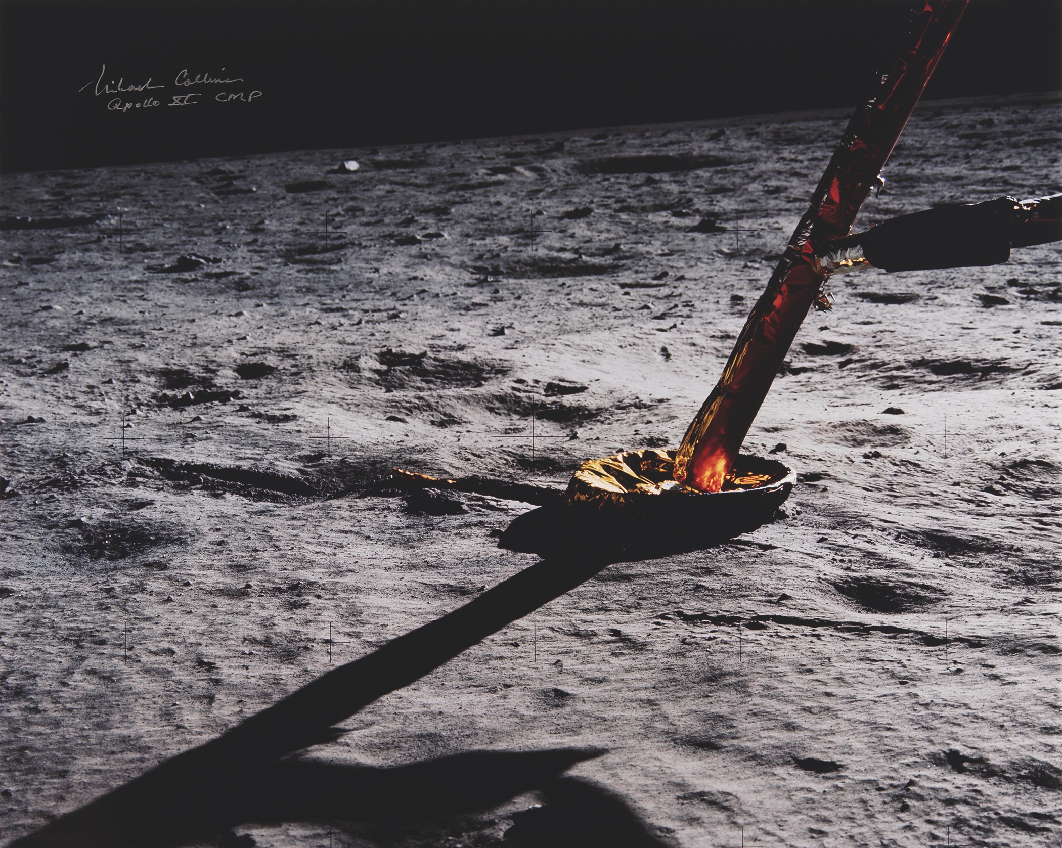 Magnificent color glossy 20 x 16 photo of a lunar module foot pad on the surface of the moon, signed in silver ink, “Michael Collins, Apollo XI CMP.” In fine condition. Accompanied by a certificate of authenticity from Novaspace.
