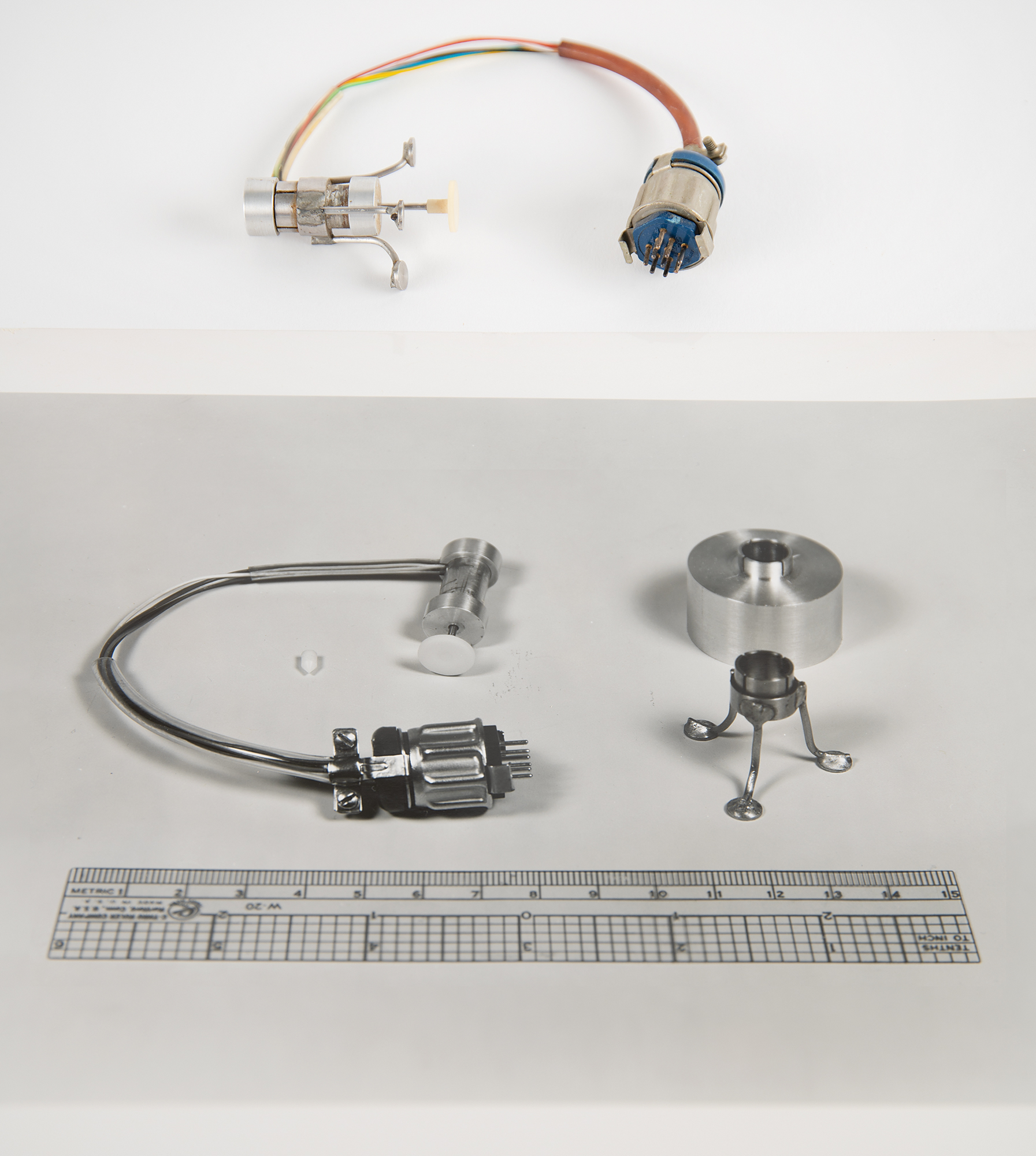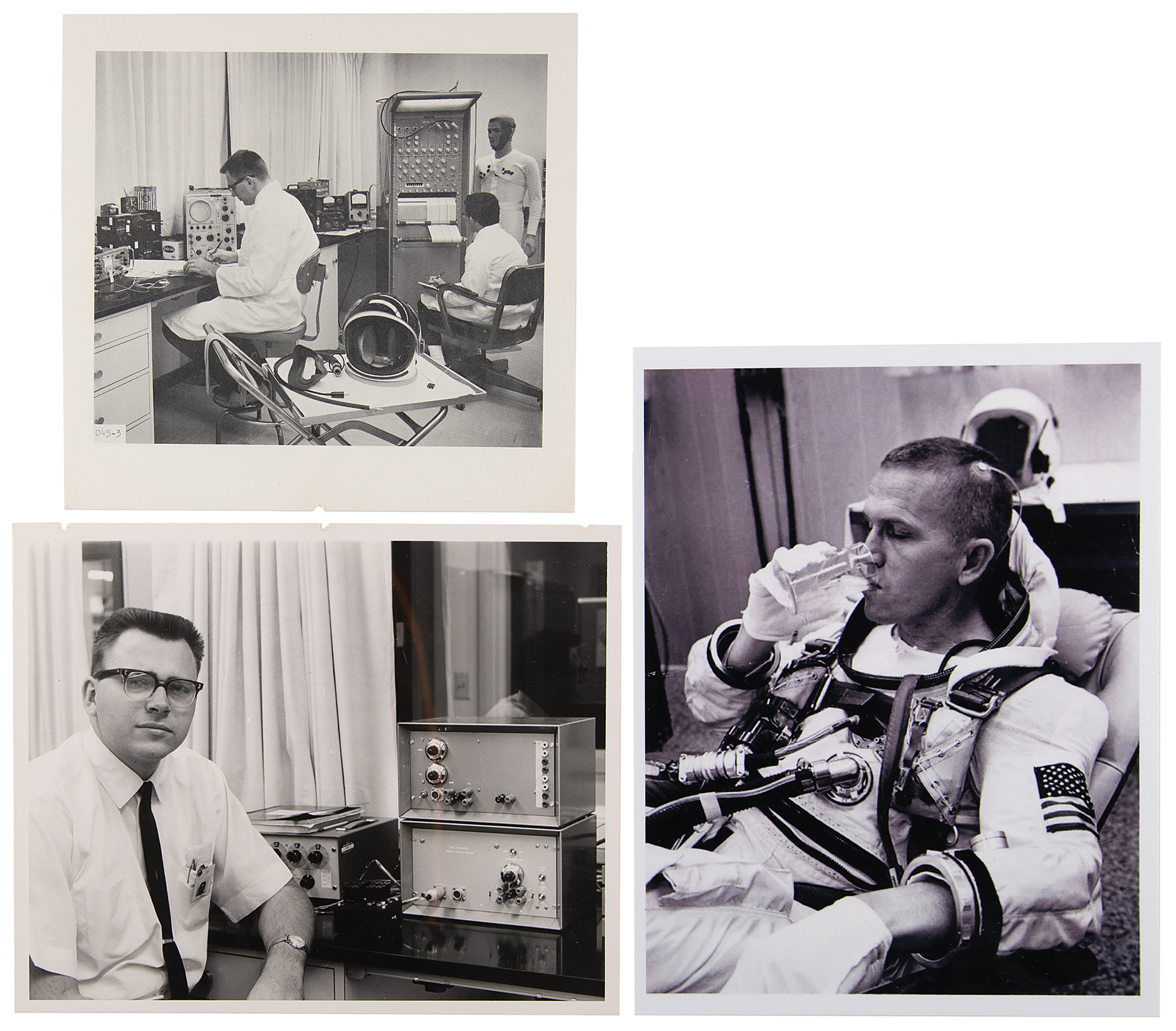 Fascinating collection of electroencephalography (EEG) and phonocardiography (PCG) hardware developed by Beckman Instruments for NASA’s Gemini program, deriving from the collection of Allan F. Pacela, manager of physiological instrumentation of Beckman’s Space Engineering Department. The lot includes three Beckman Biopotential Amplifier EEG units, with one example uncased to reveal the welded cord-wood construction technique, and a similar-looking Impedance Pneumograph unit, each measuring 1.5˝ x 2.5˝; a pair of PCG phono transducers, 1.5˝, which include seven unused metal Beckman part labels; a stack of 24 unused ‘Phono Sig Cond’ Beckman part labels; and four unidentified components, ostensibly for an EEG sensor level. The ESC units bear matching Beckman parts labels that read: “MSC-EEG-SIG-GF-BI, EC 30,009, MFD By Beckman, Contr. No. NAS 9 3456, Part No. 855-141837,” with two bearing serial numbers “007” and “011.” In overall fine condition, with some component wear.