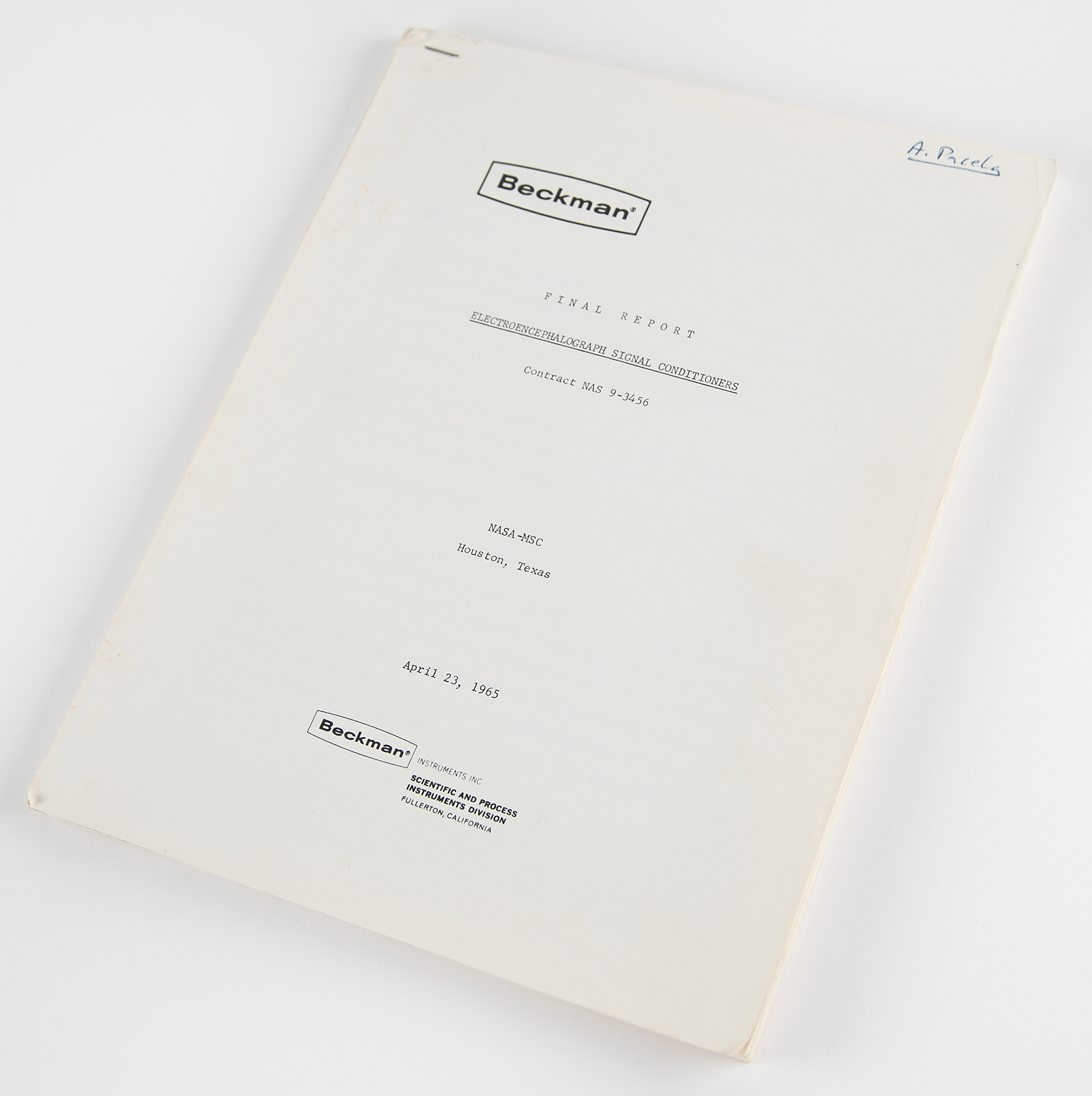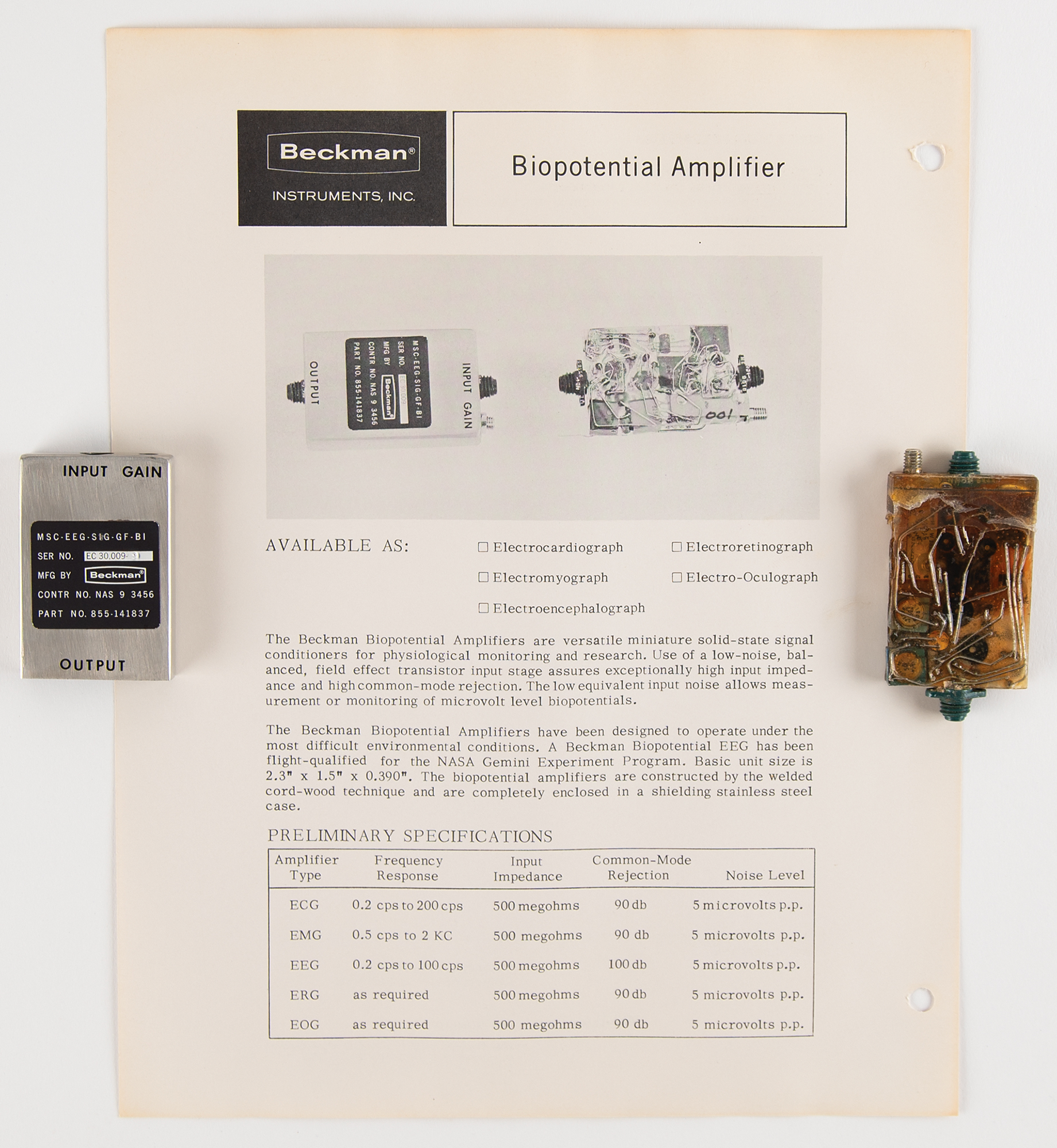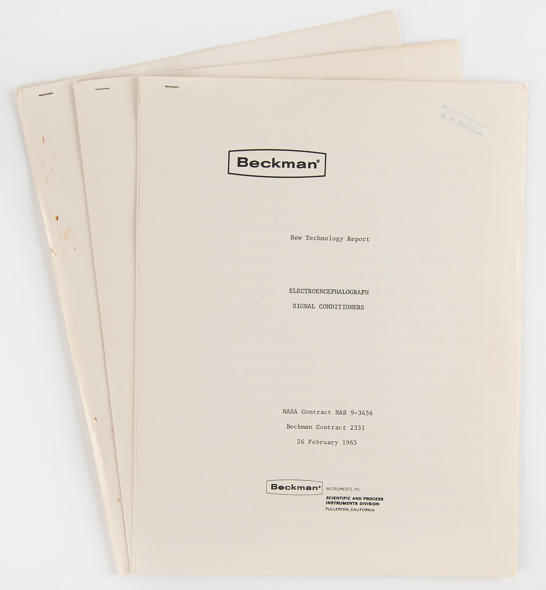The collection is accompanied by ample documentation related to Pacela’s work on the Gemini Electroencephalograph and Phonocardiograph, including copies of Beckman’s ‘New Technology Report, Electroencephalograph Signal Conditioners,’ from February 26, 1965; Beckman Instruments specification booklets; a bracket-bound 155-page ‘Qualification Test Report, Electroencephalograph Signal Conditioner,’ with test completion date of April 8, 1965; a stapled Beckman ‘Final Report’ for Contract NAS 9-3456, ‘Electroencephalograph Signal Conditioners’; fives copies of the ‘Differential Field Effect Transistor Amplifier Analysis’ report; two Beckman Instruments blueprints from the Space Engineering Division for the ‘EEG Signal Conditioner Schematic Diagram’; and sundry handwritten testing sheets.