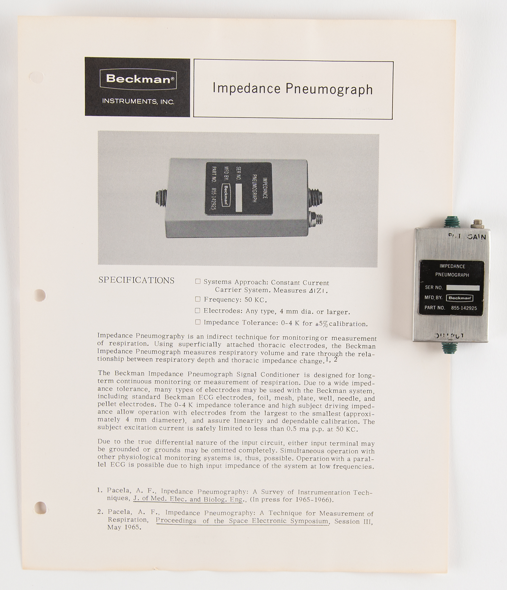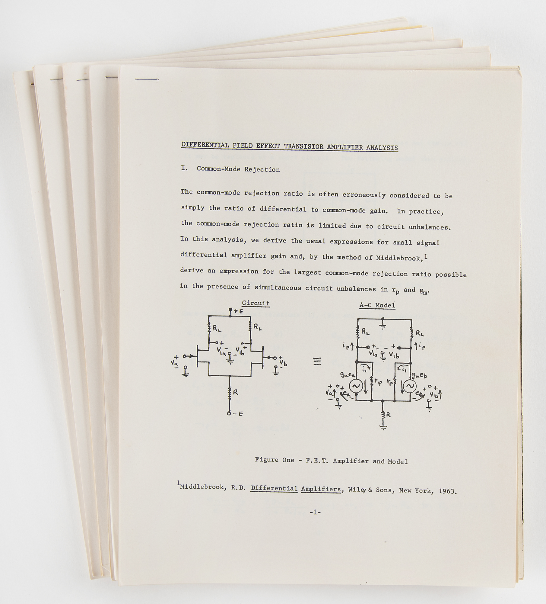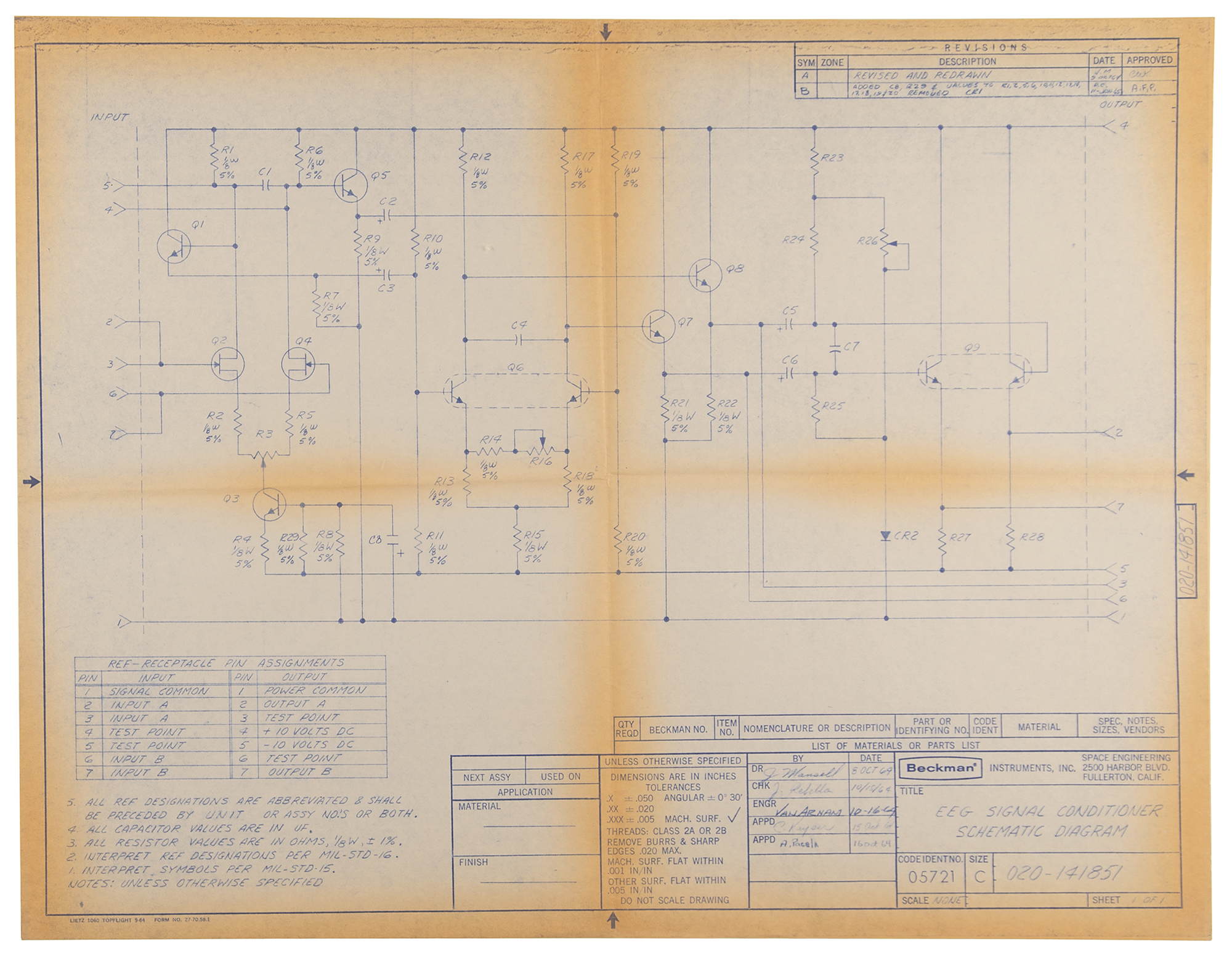 The collection is accompanied by ample documentation related to Pacela’s work on the Gemini Electroencephalograph and Phonocardiograph, including copies of Beckman’s ‘New Technology Report, Electroencephalograph Signal Conditioners,’ from February 26, 1965; Beckman Instruments specification booklets; a bracket-bound 155-page ‘Qualification Test Report, Electroencephalograph Signal Conditioner,’ with test completion date of April 8, 1965; a stapled Beckman ‘Final Report’ for Contract NAS 9-3456, ‘Electroencephalograph Signal Conditioners’; fives copies of the ‘Differential Field Effect Transistor Amplifier Analysis’ report; two Beckman Instruments blueprints from the Space Engineering Division for the ‘EEG Signal Conditioner Schematic Diagram’; and sundry handwritten testing sheets.
