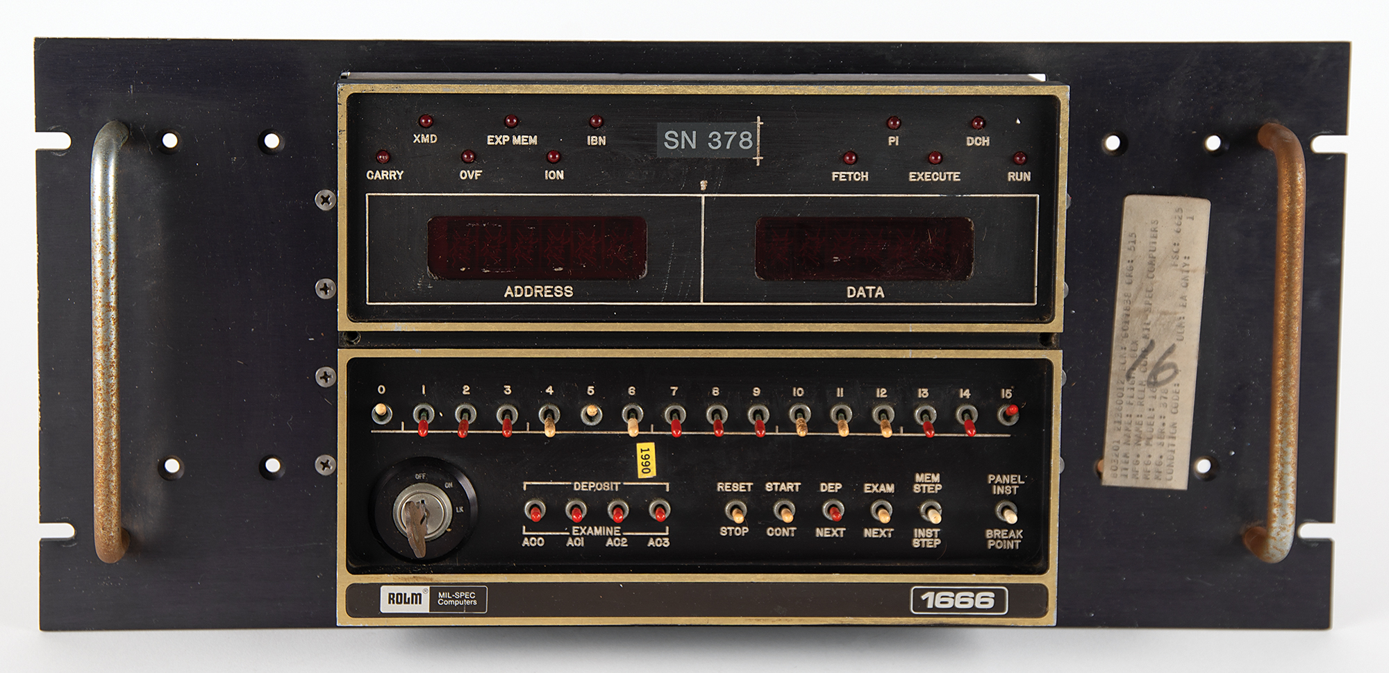 Rack-mountable ROLM computer control panel, measuring 19˝ x 8.75˝ x 6˝, with a ROLM Mil-Spec Computers label on the top: "Control Panel, Model 1648, Serial No. 378, Options 42, 81, Assembly 1 of 1, Loc. A4." Tied to the grounding pin is a NASA-JSC parts control tag, and affixed to the front plate is a label designating it as a "Flight Box." The control panel boasts several LED indicators ("Carry," "XMD," "OVF," "Exp Mem," "ION," "IBN," "Fetch," "Execute," "Run"), two display screens marked "Address" and "Data," a bank of 16 toggle switches, and control switches along the bottom. In very good to fine condition. The control panel is likely affiliated with the Spacelab program, as it is rack-mountable and originates from JSC.