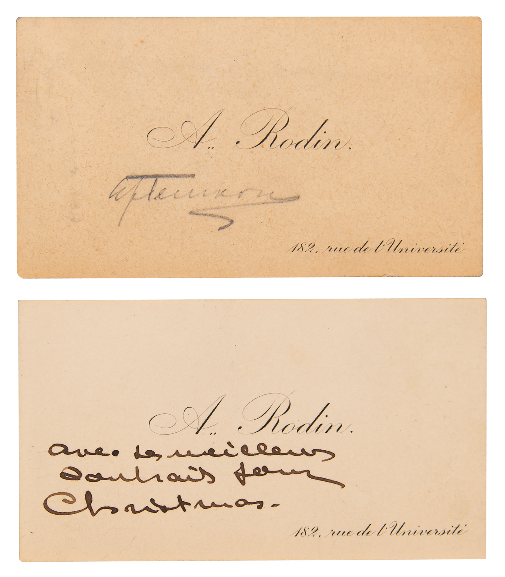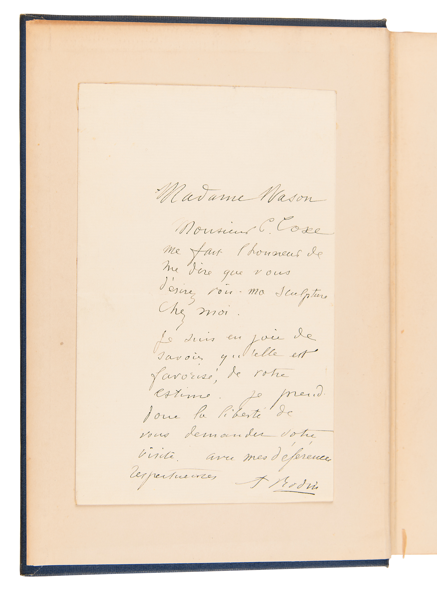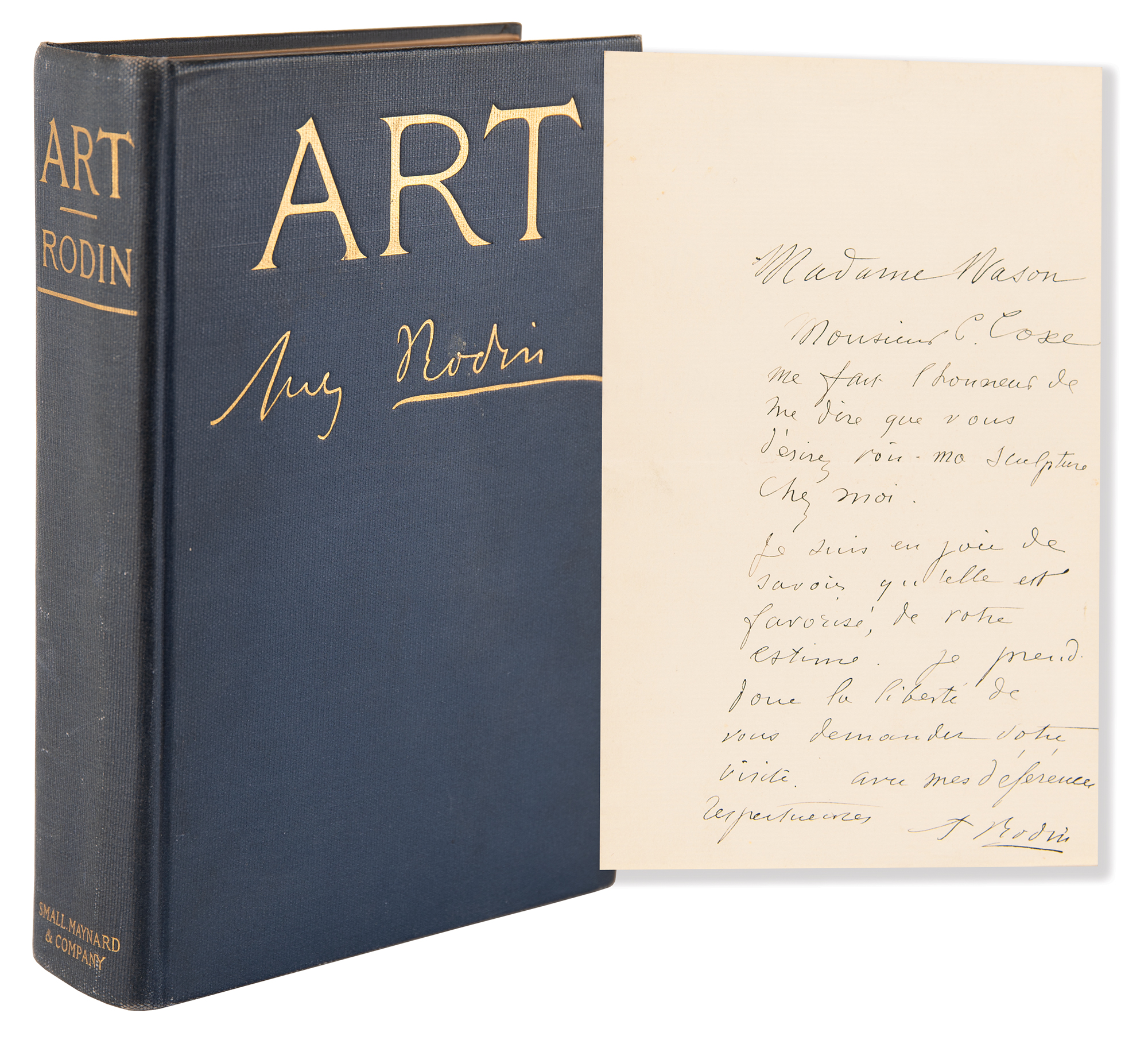 ALS in French, signed “A. Rodin,” one page, 5 x 8, no date. Handwritten letter by Auguste Rodin to "Madame Mason," saying that he has heard that she wishes "to return my sculpture to me." Affixed inside the front cover of a hardcover first edition of Art by Auguste Rodin, published in Boston by Small, Maynard & Company in 1912, 7.25 x 10.5, 259 pages, featuring 106 illustrations of Rodin's works in half-tone and photogravure. Loosely laid in are two of Rodin's personal calling cards, 3.25 x 1.75 imprinted with his name and the address of his studio, "A. Rodin, 182 rue de l'Universite," and annotated in unknown hands. The letter is in fine condition; the book is very good, with the frontispiece photogravure detached but present.