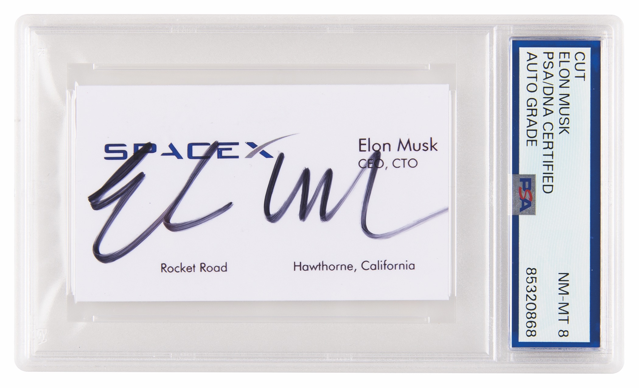 Felt tip signature, ?Elon Musk,? on a glossy white ??3.25 x 1.75 sheet printed to resemble Musk?s personal SpaceX business card, which lists Musk as ?CEO, CTO? above the company?s headquarters address: ?Rocket Road, Hawthorne, California.? In very fine condition. Encapsulated and graded by PSA/DNA as ?NM-MT 8.?