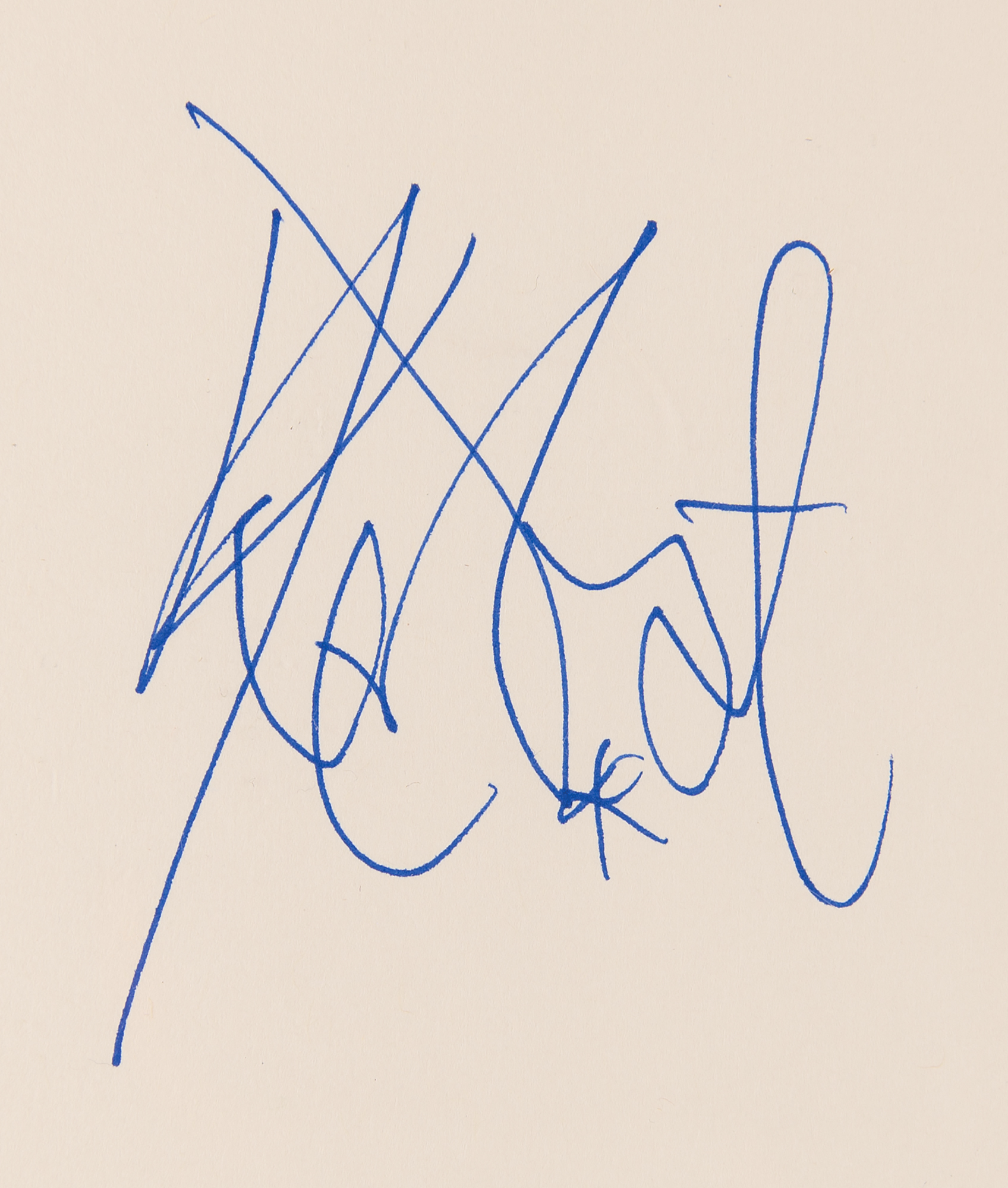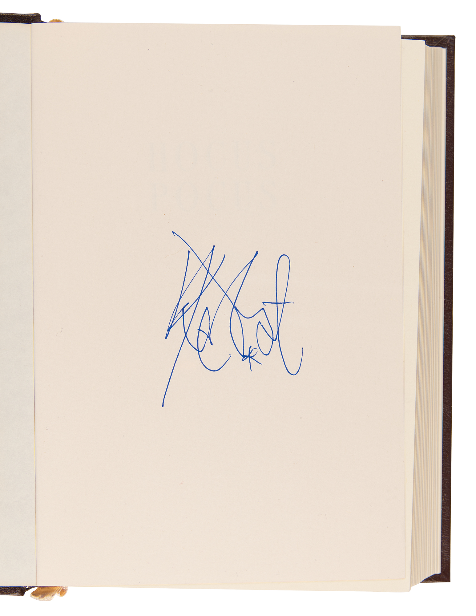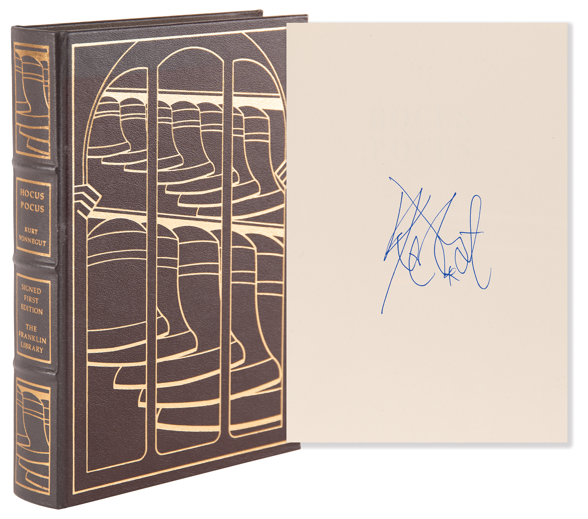 Signed book: Hocus Pocus. Limited first edition. Franklin Center, PA: Franklin Library, 1990. Leatherbound hardcover, 6.5 x 9.25, 302 pages. Signed on the first free end page in blue felt tip by Kurt Vonnegut. In very fine condition.