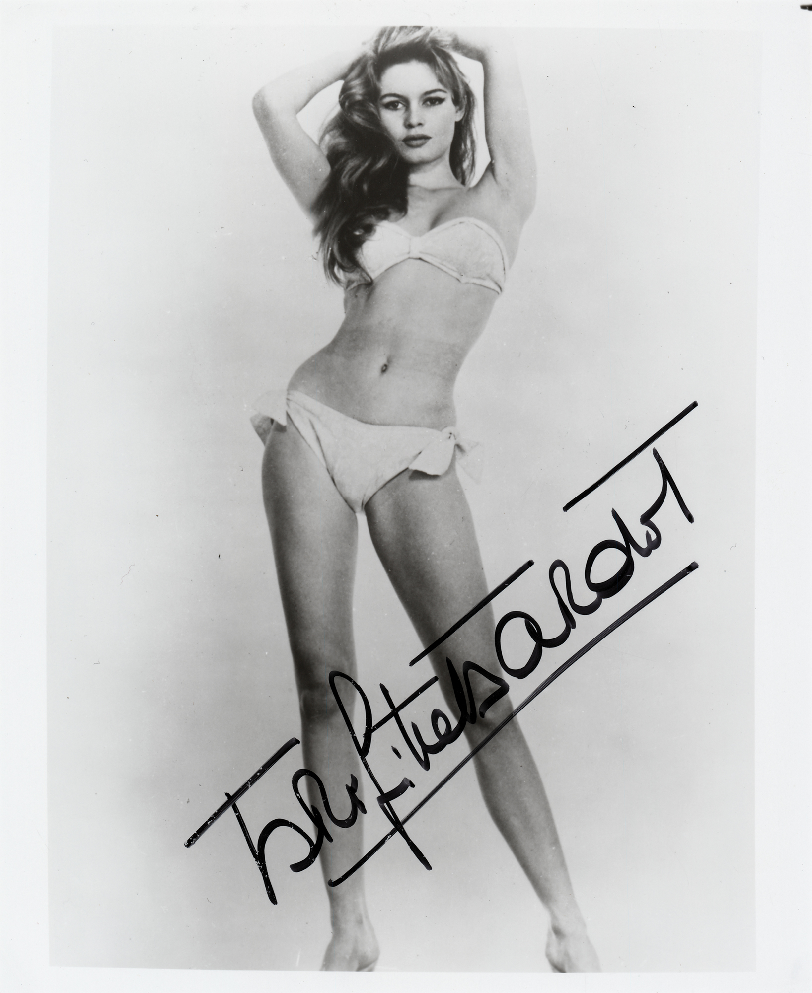 Glossy 8 x 10 photo of Brigitte Bardot striking a pose in a sexy bikini swimsuit, prominently signed in black felt tip. In fine condition, with slightly irregular ink adhesion.