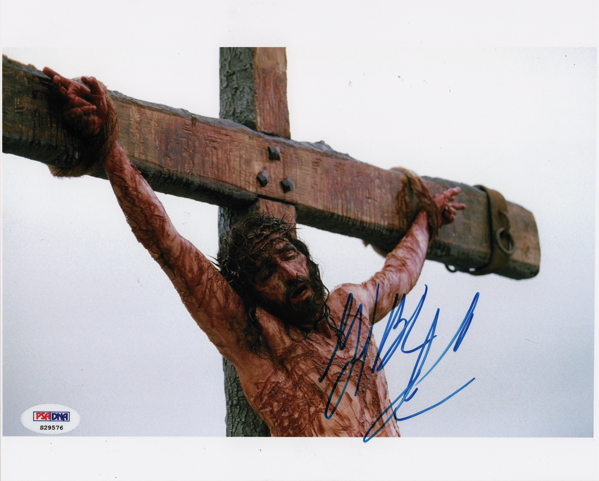 Color glossy 10 x 8 photo of Jim Caviezel as Jesus Christ in the 2004 biblical drama The Passion of the Christ, signed in blue felt tip. In very fine condition, with a PSA/DNA label affixed to the lower left corner. Accompanied by a certificate of authenticity from PSA/DNA.
