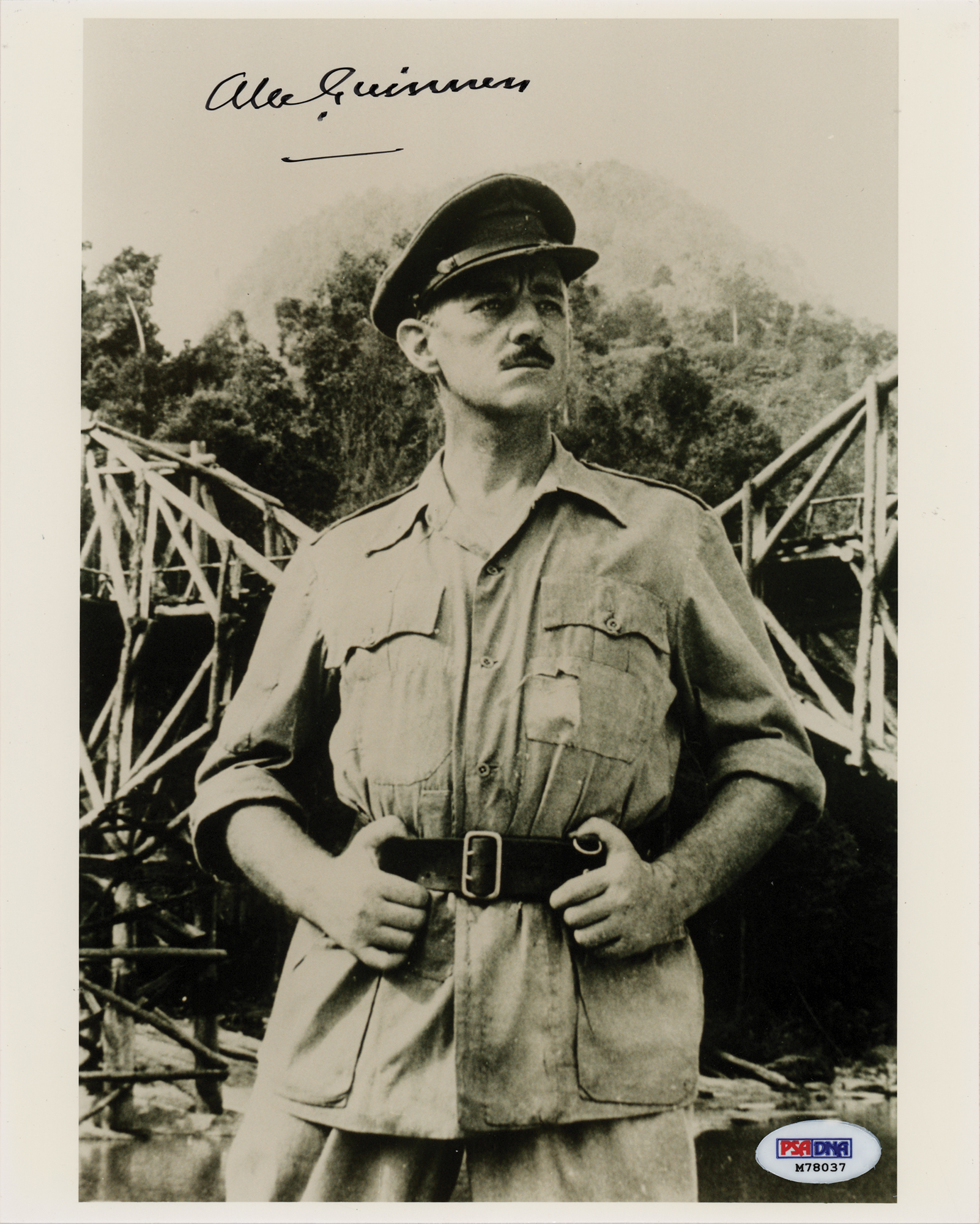 Glossy 8 x 10 photo of a young Alec Guinness in the 1957 epic war film The Bridge on the River Kwai, signed in black felt tip. In very fine condition, with a PSA/DNA label affixed to the lower right corner. Accompanied by a certificate of authenticity from PSA/DNA.