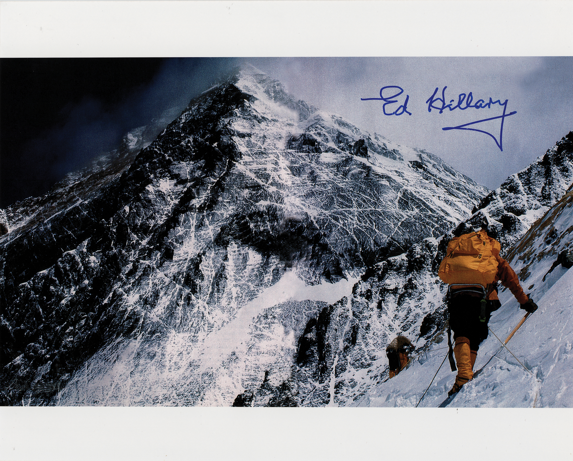Color glossy 10 x 8 photo of two mountaineers making their way over to Mount Everest, signed in blue felt tip, “Ed Hillary.” In very fine condition.