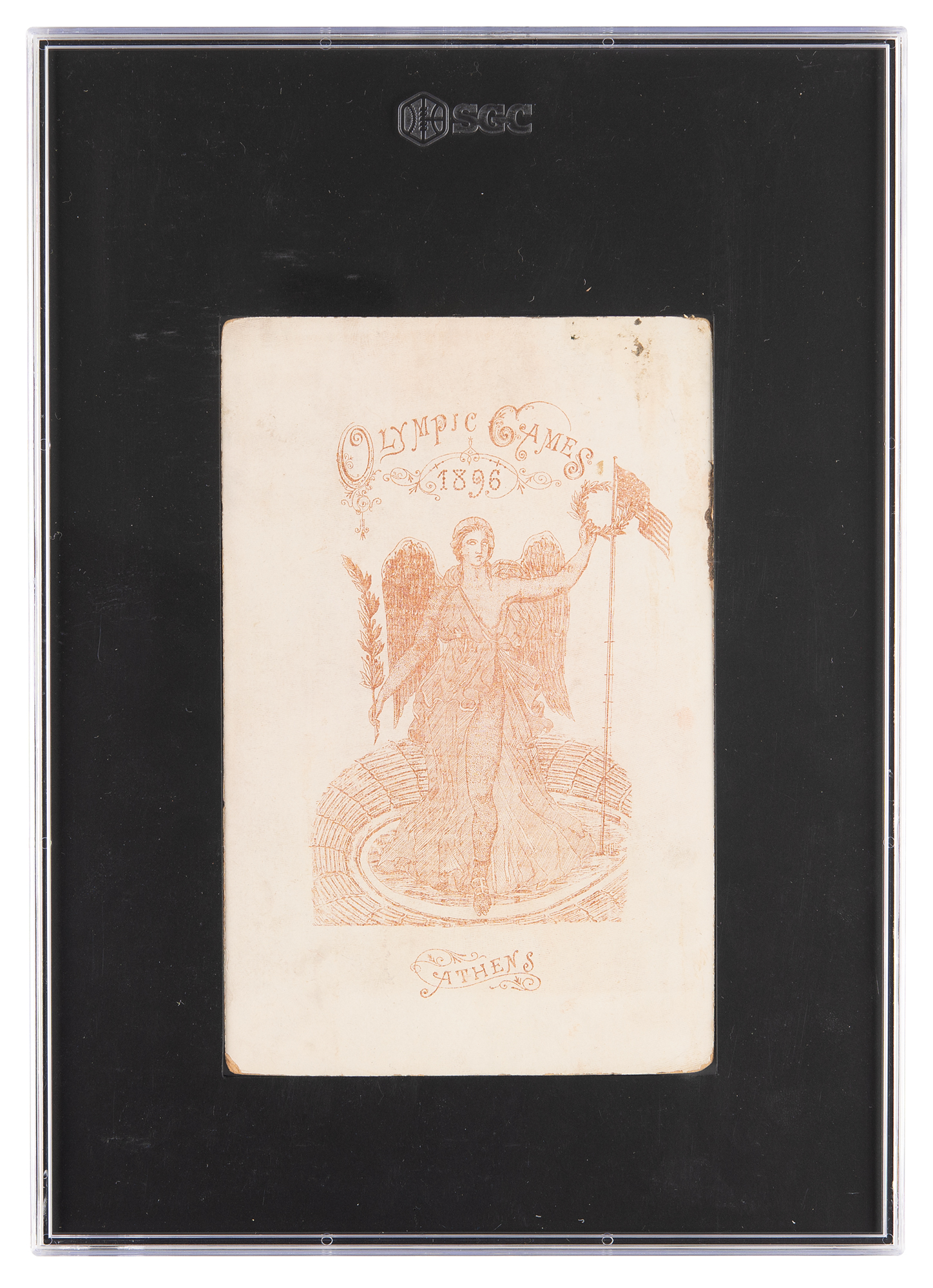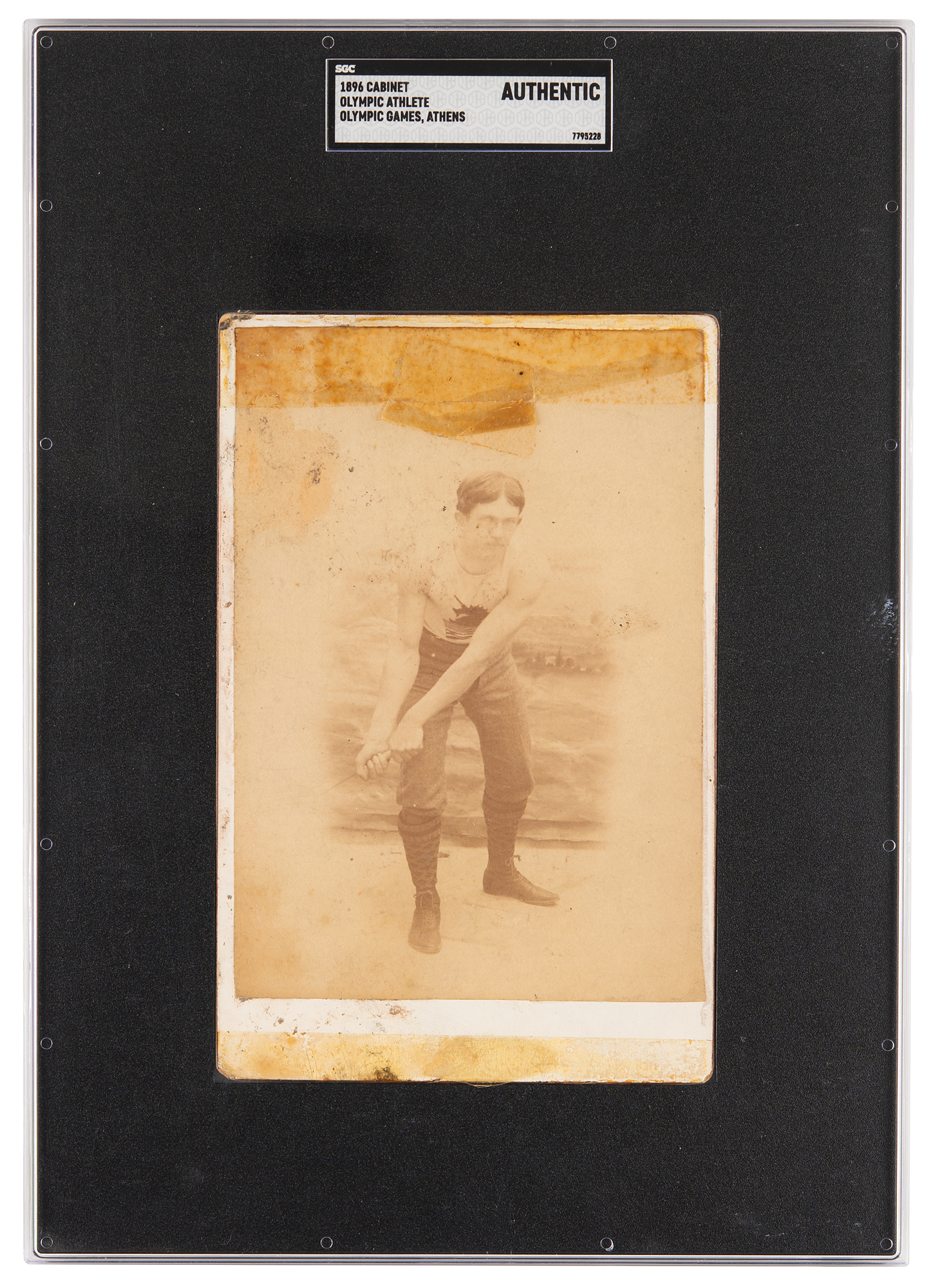 Exceedingly rare original 4.25 x 6.5 cabinet photograph of American track and field athlete Ellery Harding Clark (1874-1949), who was the first modern Olympic champion in high jump and long jump at the Athens 1896 Olympics. Clark is portrayed practicing the hammer throw during pre-trials, an event which would not debut at the Olympics until 1900. The reverse is beautifully imprinted with an "Olympic Games, 1896, Athens" backstamp—the only known such example. In very good condition, with soiling and slight fading to the image, and old clear tape along the top and bottom edges. Encapsulated as authentic by SGC.