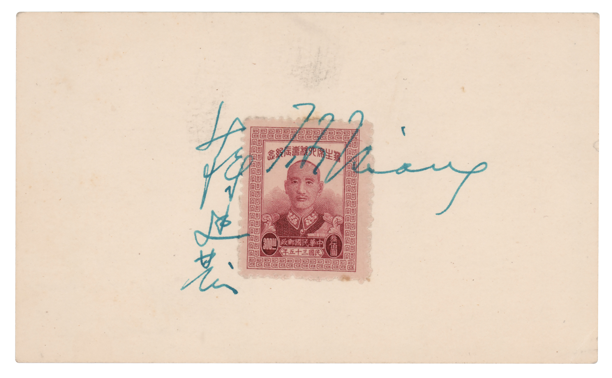 Chinese historian and diplomat (1895-1965) who served as ambassador to the US and principal delegate to the United Nations. Vintage fountain pen signatures in English and Chinese, "T. F. Tsiang,” over a stamp portraying Chiang Kai-shek applied to an off-white 5 x 3 card. In fine condition.